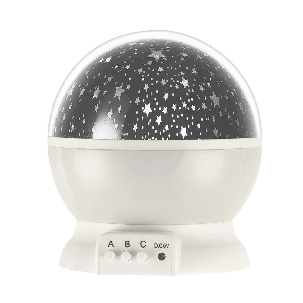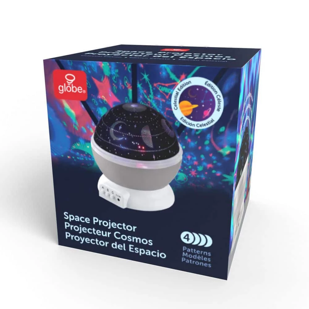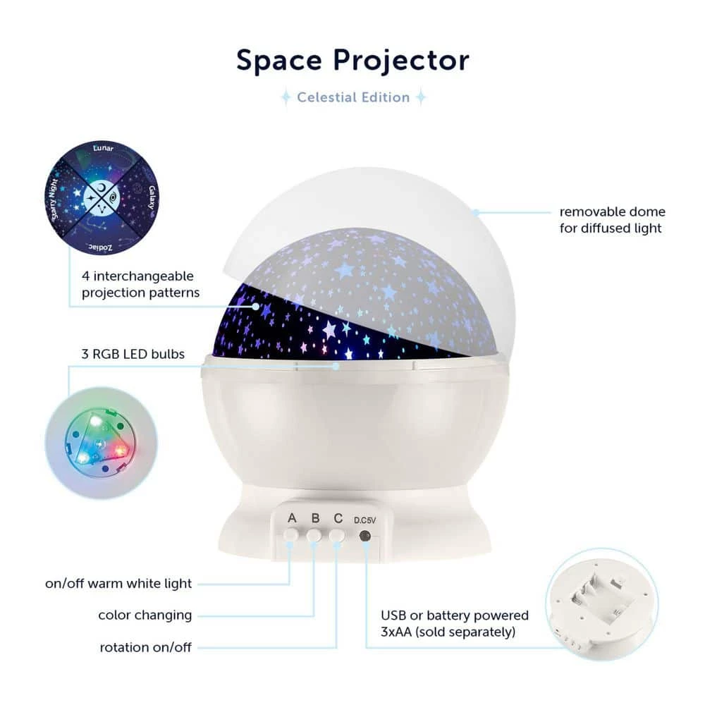 The fun and playful Celestial Space Projector LED Integrated Night Light by Globe Electric offers an exciting experience for the entire family. With an outer space theme, this rotating projector is perfect for all ages and would be ideal for a bedroom, playroom or any dry location where you wish to explore the cosmic space above. The celestial projector comes with four interchangeable lenses – choose between a galactic, lunar, zodiac or starry night illumination. With different lighting options you can pick the light you want by using the 3 buttons located on the base of the night light projector. Choose between a warm white light or a color changing light and choose if you want the projector to rotate or not. You and your family will never run out of ways to have fun and enjoy this ambient lighting experience throughout your home. This light is user-friendly and can be operated with either a USB cable (included) or by inserting 3 Amp batteries (sold separately).