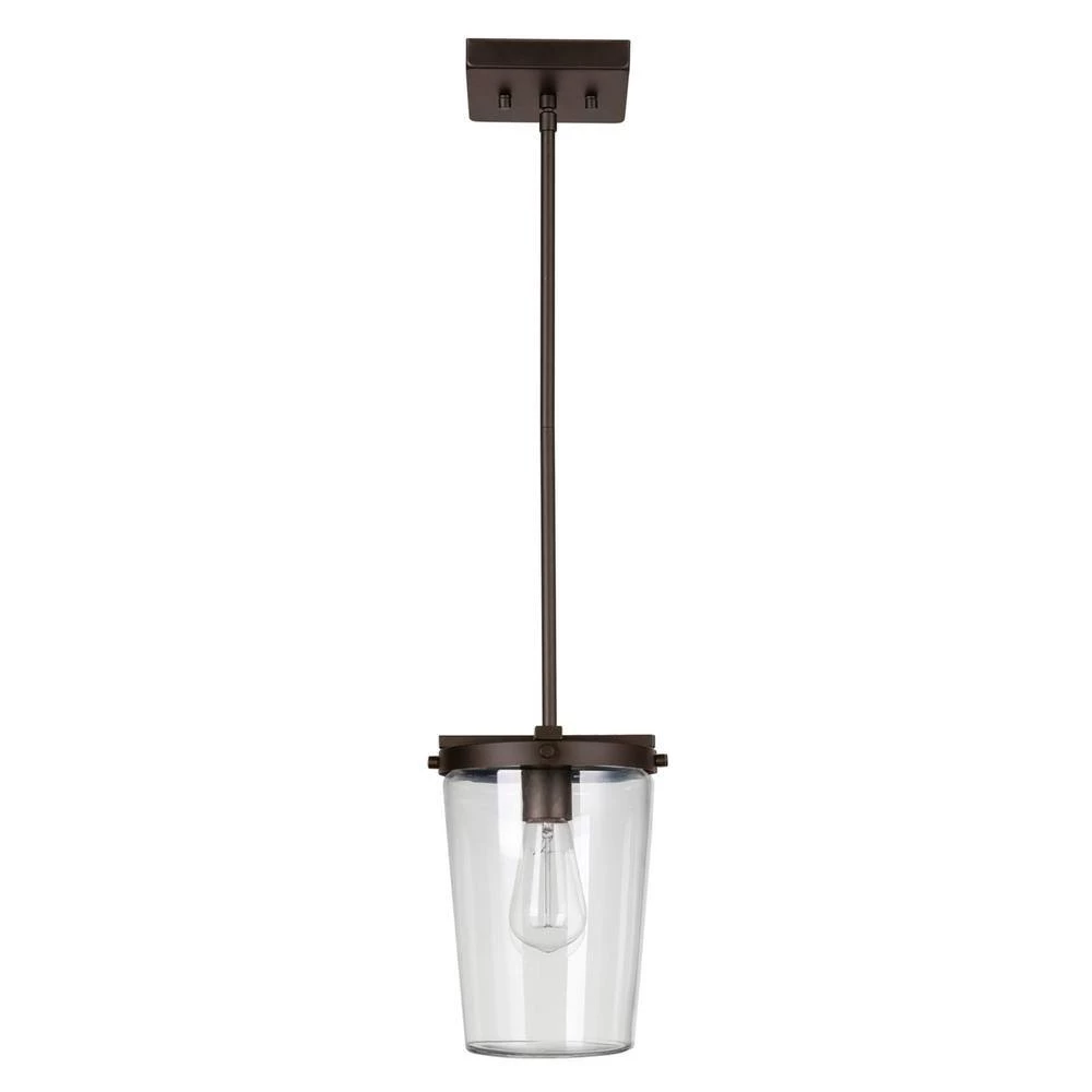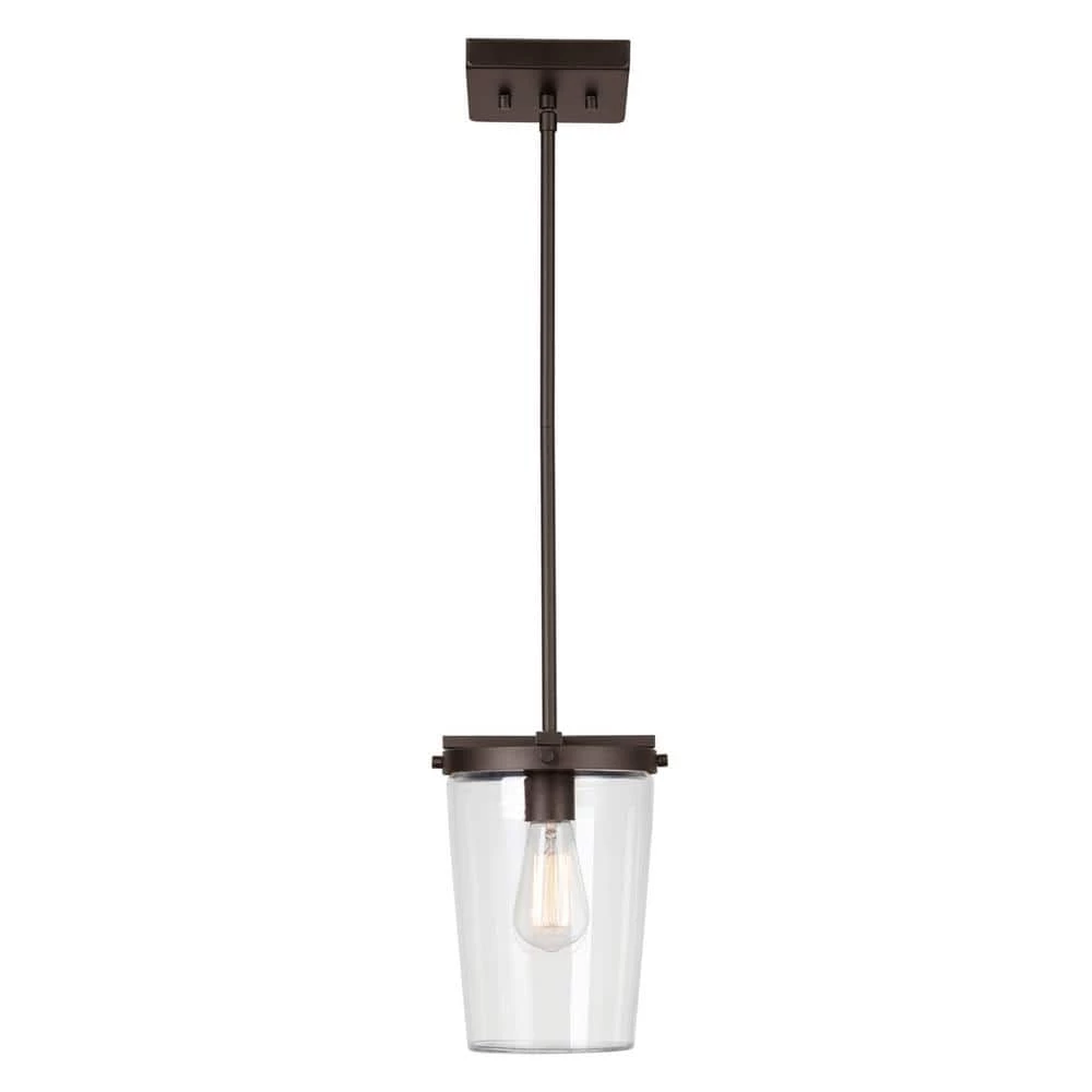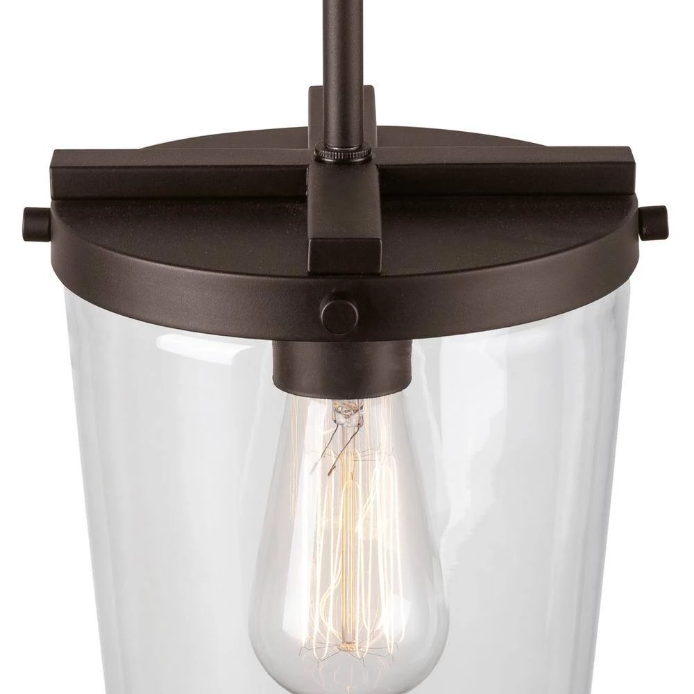 The warm bronze finish of the 1-light Outdoor Pendant Light by Globe Electric offers vintage design for every room in your home. Ideally suited to hang outside, this pendant has a tapered glass shade that is covered to withstand light exposure to sun, wind and rain however, the gorgeous shape looks beautiful inside your kitchen or dining area. The hanging bar comes in 3-pieces so you can customize the length to suit your lighting needs.