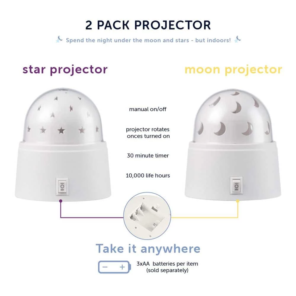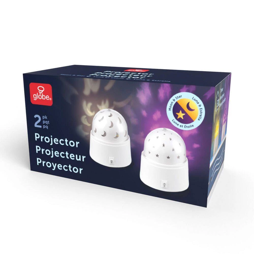The unique and portable Rotating Projector Star and Moon LED Integrated Night Light Set by Globe Electric offers a fun experience for the entire family. With 2 separate projectors, you can choose the pattern you want for any occasion and interchange them as often as you wish. For the ultimate ambient light, we suggest using both projectors at the same time – in different rooms around your home. Both the purple star and yellow moon projectors are equipped with a user-friendly 30-minute timer so you can confidently place this light in your child’s bedroom during naptime without the stress of forgetting to turn it off. Thanks to the convenience of a two-pack, you and your family will never run out of ways to have fun and enjoy the stunning ambient lighting effect. 3 AA batteries are required for each night light and are sold separately.