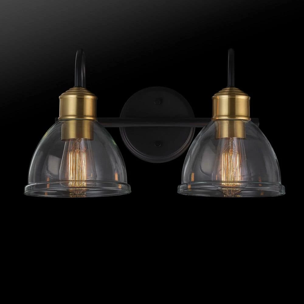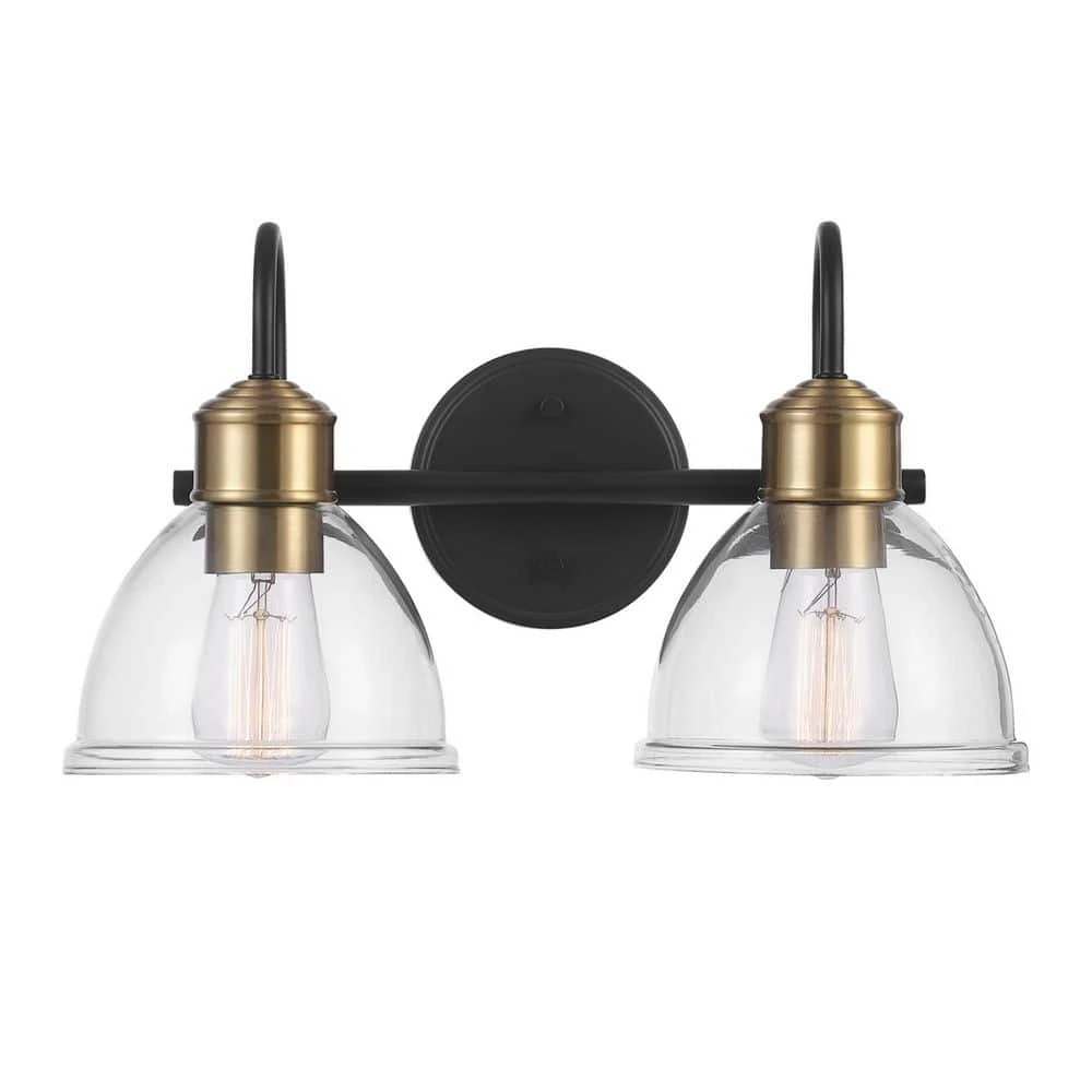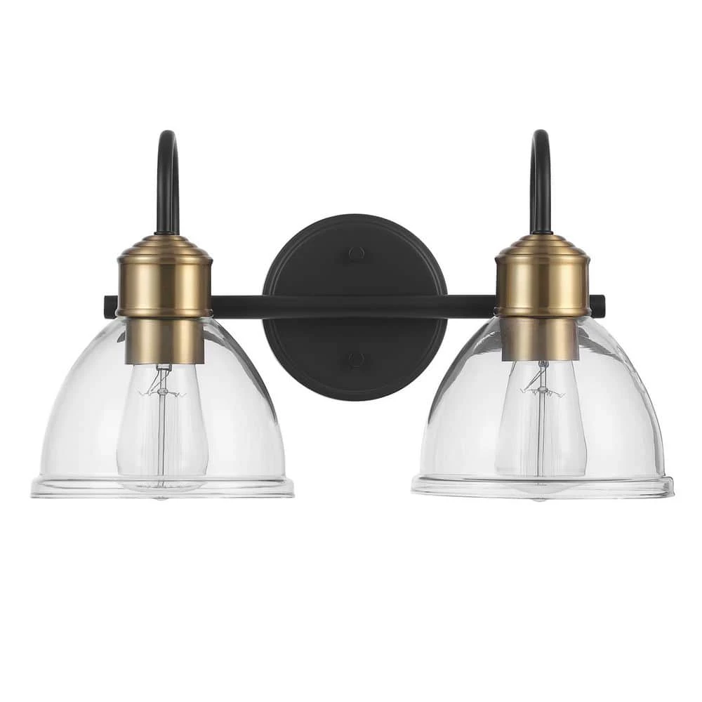 Taking a bold style and adding modern touches such as a curved sconce arm and a classic bowl shade, the Brown 2-Light Vanity Light by Globe Electric is the epitome of the dark academia design trend. Utilizing a stunning shape, a matte black finish and antique brass accent socket, this light brings unique appeal to your home. Attached to the wall with a round backplate the Brown Vanity Light has two clear glass shades that showcase the bulbs of your choice. Use vintage Edison bulbs to complete the moody vibe or try designer bulbs for a more modern design. Since it uses standard E26 base bulbs, the options are endless. Check out the other pieces from the Brown Collection by Globe Electric to bring a cohesive look throughout your home.