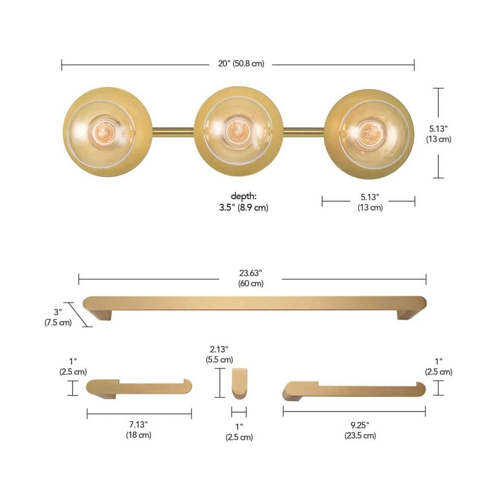 - All-In-One update your bathroom easily with a matching 3-light vanity fixture, towel bar, toilet paper holder, towel ring and robe hook with a matte brass finish and a truly vintage appeal
