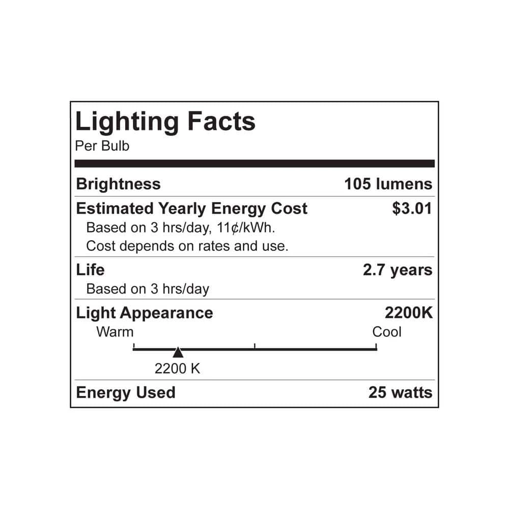 - Light output: 105 lumens – 25 watts – 2700 kelvin (soft white) – 3,000 hour bulb life