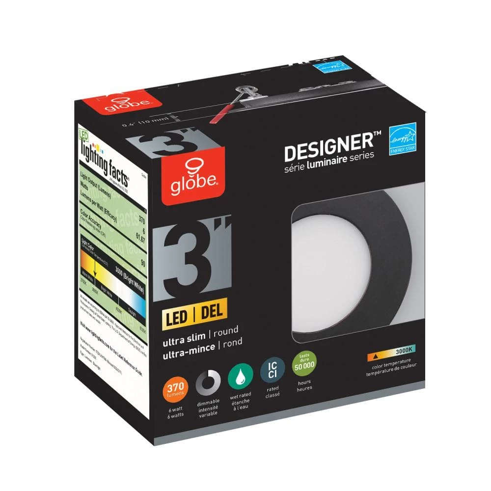 Globe Electric’s Ultra Slim Recessed Lighting Kits are the recessed lights of the future. Each fixture is 0.4 in. (10mm) thick meaning they are ideal for locations where height clearance is limited such as beams or ductwork. Energy Star certified and IC rated for direct contact with insulation, they won’t overheat, do not require a bulky can and will last for years to come – 50 000 hours or approximately 45 years if used for 3 hours per day to be exact. Wet rated and certified airtight, this 3 in. kit is perfect for your bathroom, drop ceilings, outdoor soffits and all general lighting applications. The smaller footprint gives you an European feel and is perfect for a modern look. Each kit features an ultra slim junction box, a 24 in. (610mm) cable, easy push and click quick connects and 9 coil plastic spring clips. Sitting on top of the housing the clips are stronger and easier to use than any of our competitor’s kits. The frosted lens provides a beautiful soft light that shines with 370 lumens and uses only 6-Watt of energy to produce the brightness of a 40-Watt bulb. Cut a 3.25 in. hole for this item.