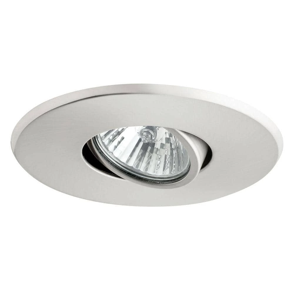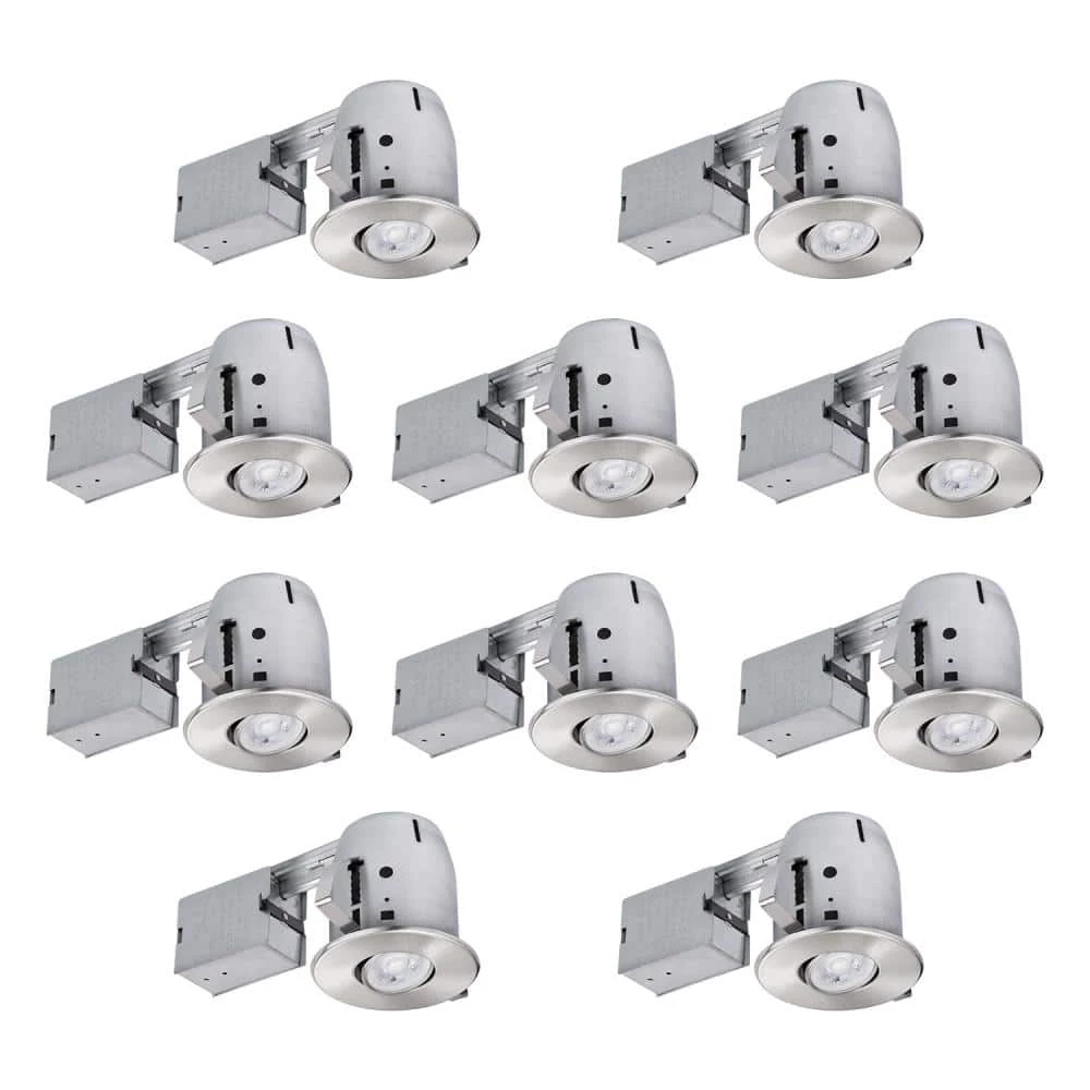 Globe Electric’s 10-pack 4 in. Round Trim Recessed Lighting Kit with round trim and brushed nickel finish is the perfect way to brighten up the interior of your home or commerce with style. Featuring patented PUSH-N-CLICK clips which are fully adjustable and extra wide to grip uneven surfaces and provide easy tool-free installation. A swivel light bulb gives you the ability to focus light on specific areas and can be directed for any desired look. An integrated cut-off switch ensures that the fixture will not overheat and can be used with or without an insulation box. Dimmable with a compatible dimmer switch (not included). Requires ten 50-Watt equivalent GU10 MR16 light bulbs (sold separately). Cut a 3.88 in. hole for this item.