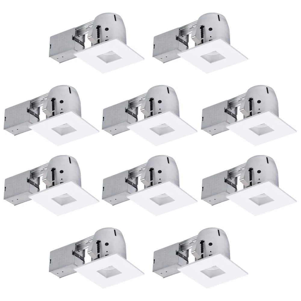 Brighten up your space with this 4 in. New Construction and Remodel White Die-Cast Recessed Lighting Kit (10-Pack). The white die-cast design gives this light a polished look. Install these lights without tools. Other features include a baffle to reduce glare and a swivel light bulb to customize lighting. A cut-off switch helps prevent the light from overheating.