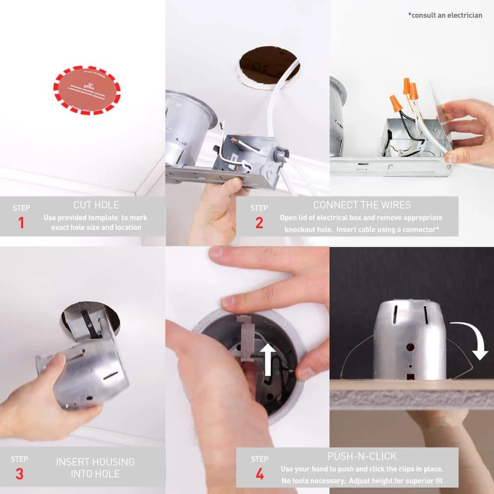 - Easy install: patented Push-N-Clickclips are fully adjustable and extra wide to grip uneven surfaces and provides for simple tool-free installation; actual hole size is 3.88 in., full trim size is 5.13 in.
