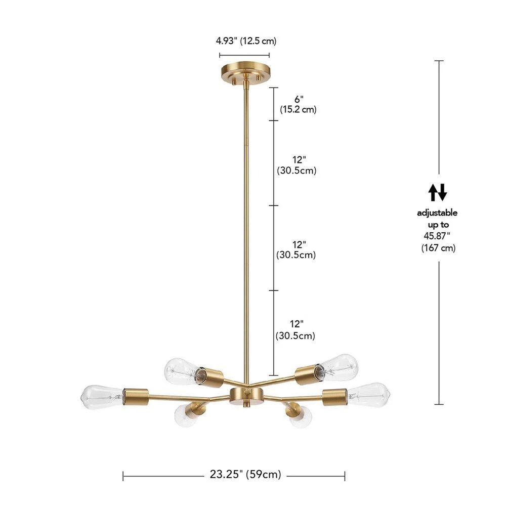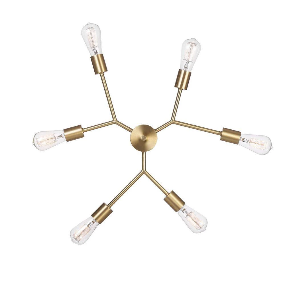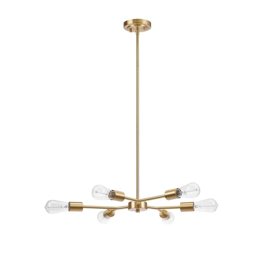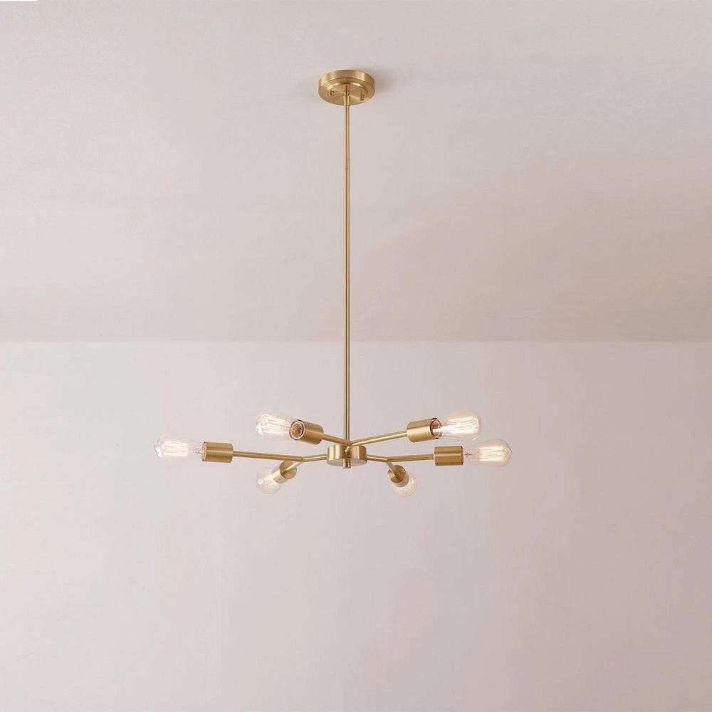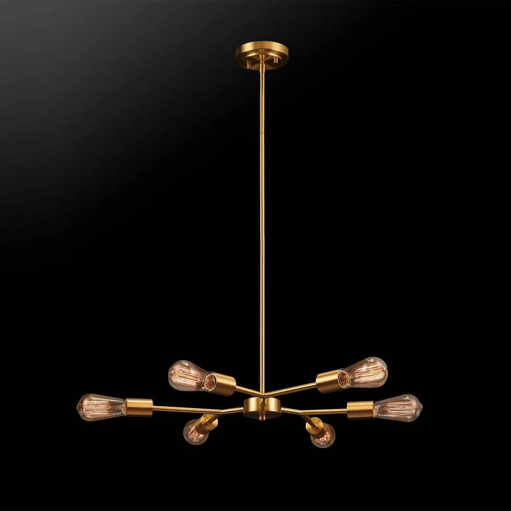 - Industrial design the industrial shape and sputnick design of the tetra 6-light chandelier is complemented by a matte brass finish and exposed bulbs to create the ideal for hanging anywhere