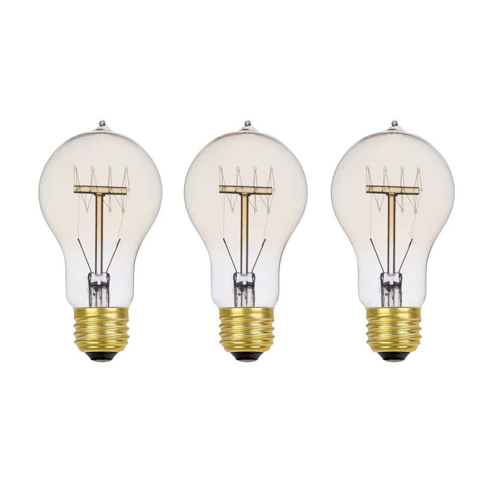 Globe Electric’s Incandescent vintage designer 60W Vintage Edison A19 Quad Loop Incandescent Filament Light Bulb with E26 base. In the early days of electrical lighting, inventors such as Thomas Edison tested and retested as they searched for long-burning filaments. In 1890, the filament choice was carbonized cotton. Globe Electric’s bulbs have a tungsten filament, which is used to reproduce the single hairpin loop of a vintage design. Position it within a clear shade or exposed socket to enjoy its shape and ambient glow. This Edison inspired bulb is a Steampunk favorite with its glowing cage-shaped filament surrounding a central glass support. Crafted to preserve the look of early 20th-century lighting. Please note, these bulbs are not as bright as modern bulbs of the same wattage and are recommended for exposed socket fixtures. Glass has a goldish amber tint which can vary in degree from light to medium. These bulbs can be dimmed and have a lifespan of 3000 hours. Pack of 3 bulbs.