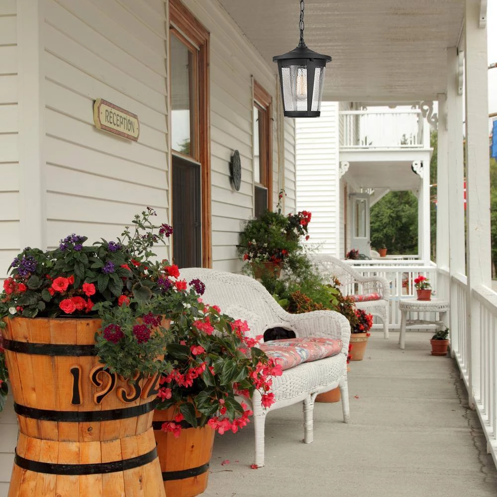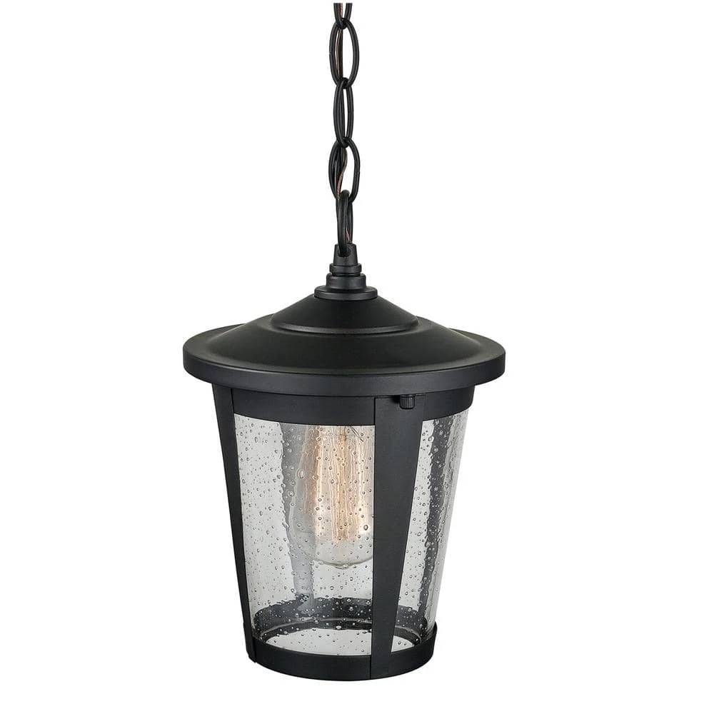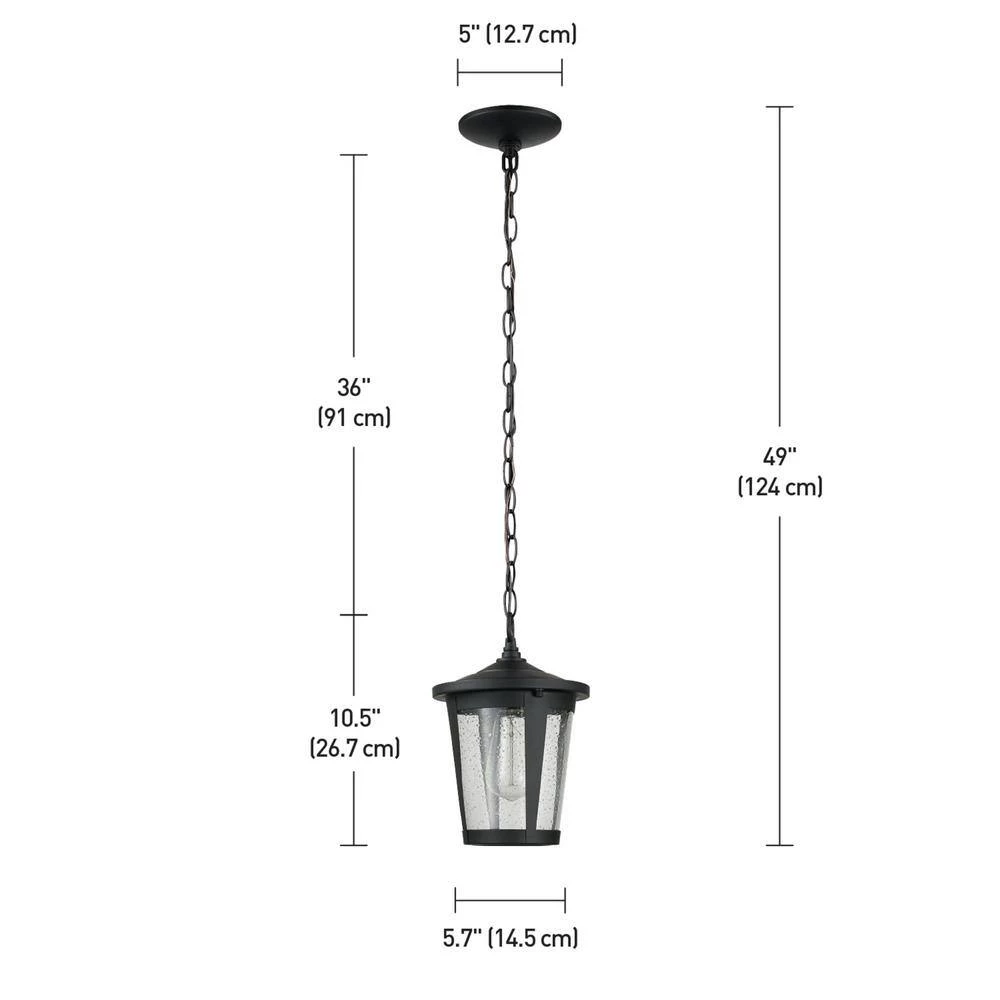 Tapered lines and a wide brim bring the Augusta Outdoor Pendant Light into the modern era while the seeded glass shade adds a rustic flair. The seamless blending of different characteristics such as refined lines and a farmhouse shade, can be used with many different styles to create a cool, crisp, understated appearance. Perfect for increasing the number of pleasurable hours you spend outdoors; this pendant is an investment that pays off handsomely in the value it adds to your home. But that’s not all! This stunning pendant can be used indoors too. The matte black finish adds warmth and dimension to your existing decor while balancing a light colored room or accenting a more rustic space. So many options!