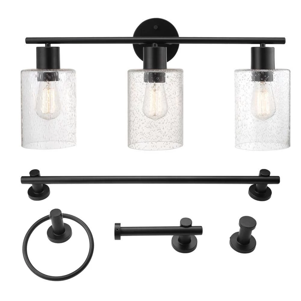 With simple, direct lines paired with vintage accents and a warm matte black finish, the Bristol 5-Piece All-In-1 Bathroom Set adds an upscale minimalist element to any space. The seeded glass shades of the vanity light fixture offer a vintage feel while minimalist accents complete the look. Update and modernize your bathroom or add the 3-light vanity to your bedroom to create a stunning getting ready nook. Complete with a towel bar, towel ring, robe hook and toilet paper holder also in matte black, your bathroom will look streamline and welcoming. While the pieces complement each other you can split this set up and use it throughout your home. The towel bar makes an excellent shoe holder. The towel ring would be great in your kitchen. The vanity light would work in your bedroom, bathroom or kitchen. with the ability to use this light as an up-light or a downlight, the options are endless. Unleash your interior designer and think creatively. Think outside the box.