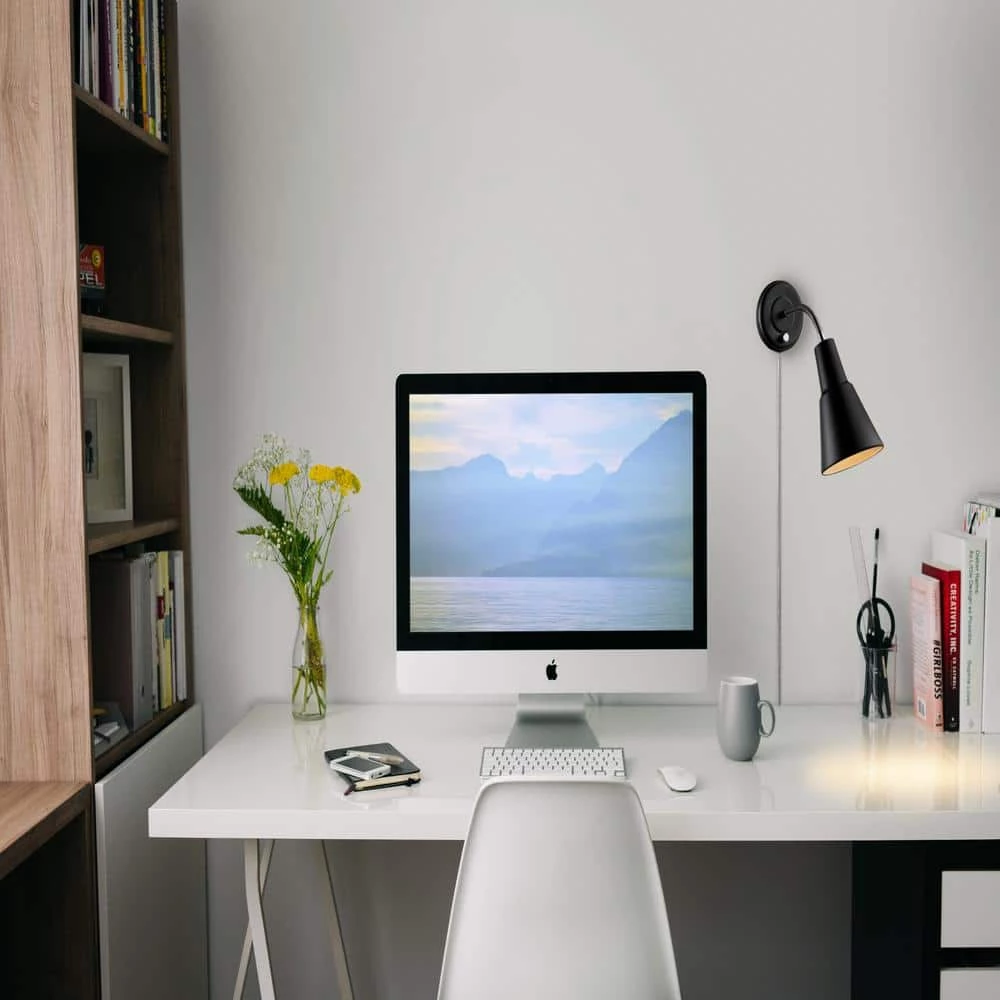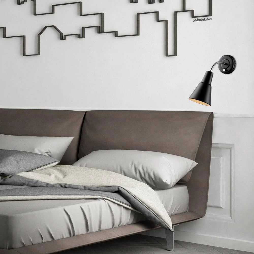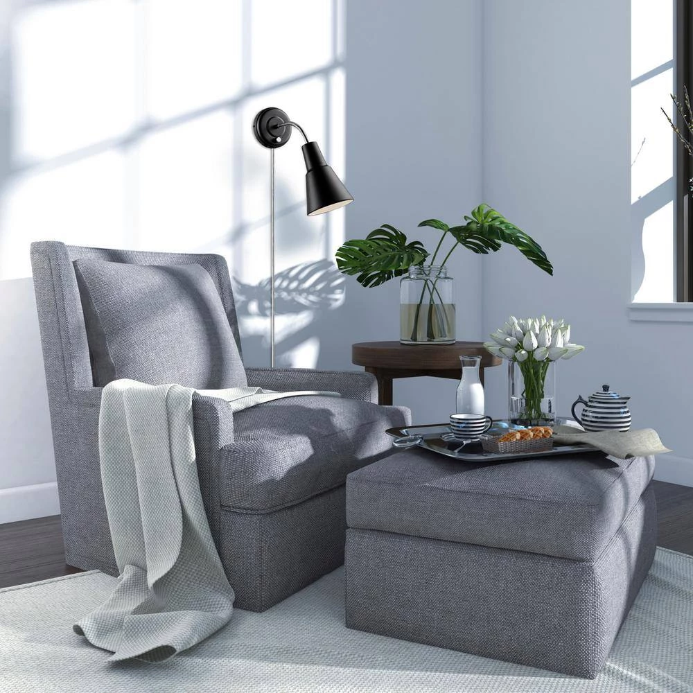 - Modern design: with a classic straight bell shade, matte black finish, and chrome gooseneck, the collins plug-in or hardwire wall sconce complements any decor with a functional modern twist