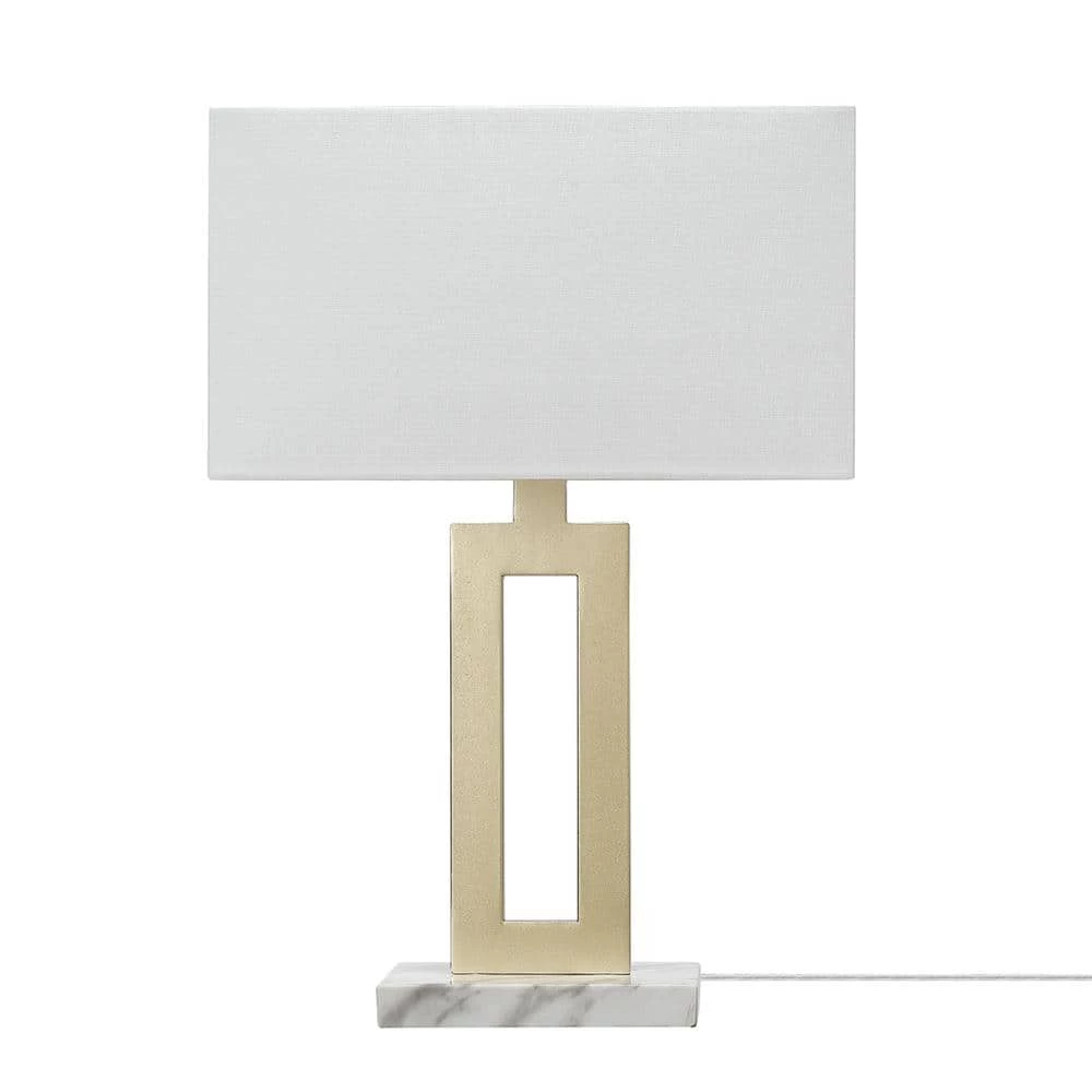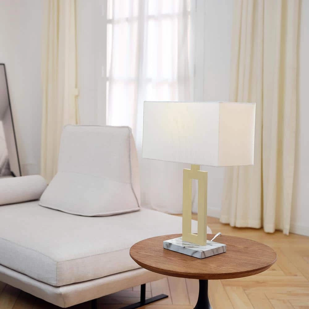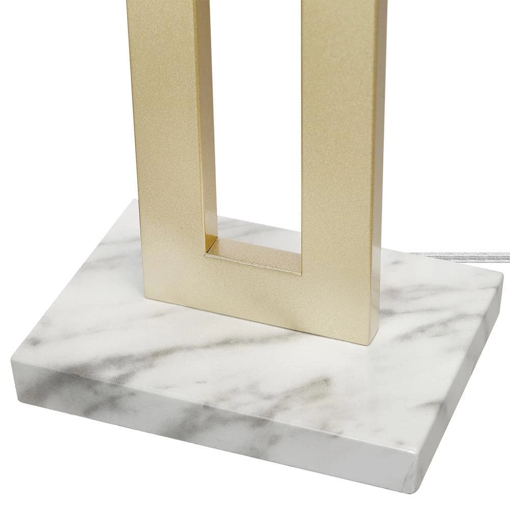 The D’Alessio Lamp collection offers modern styling for any room. A rectangular shape and a painted gold finish combine to add a stylish modern element to any space. The white linen shade is a classic element that upscales this lamp while the trendy cutout body adds style. Finished with a white faux marble base, this lamp is ideal in any room. The unobtrusive 20 in. size works perfectly in a bedroom, office space or living room and can only enhance any table it sits on.