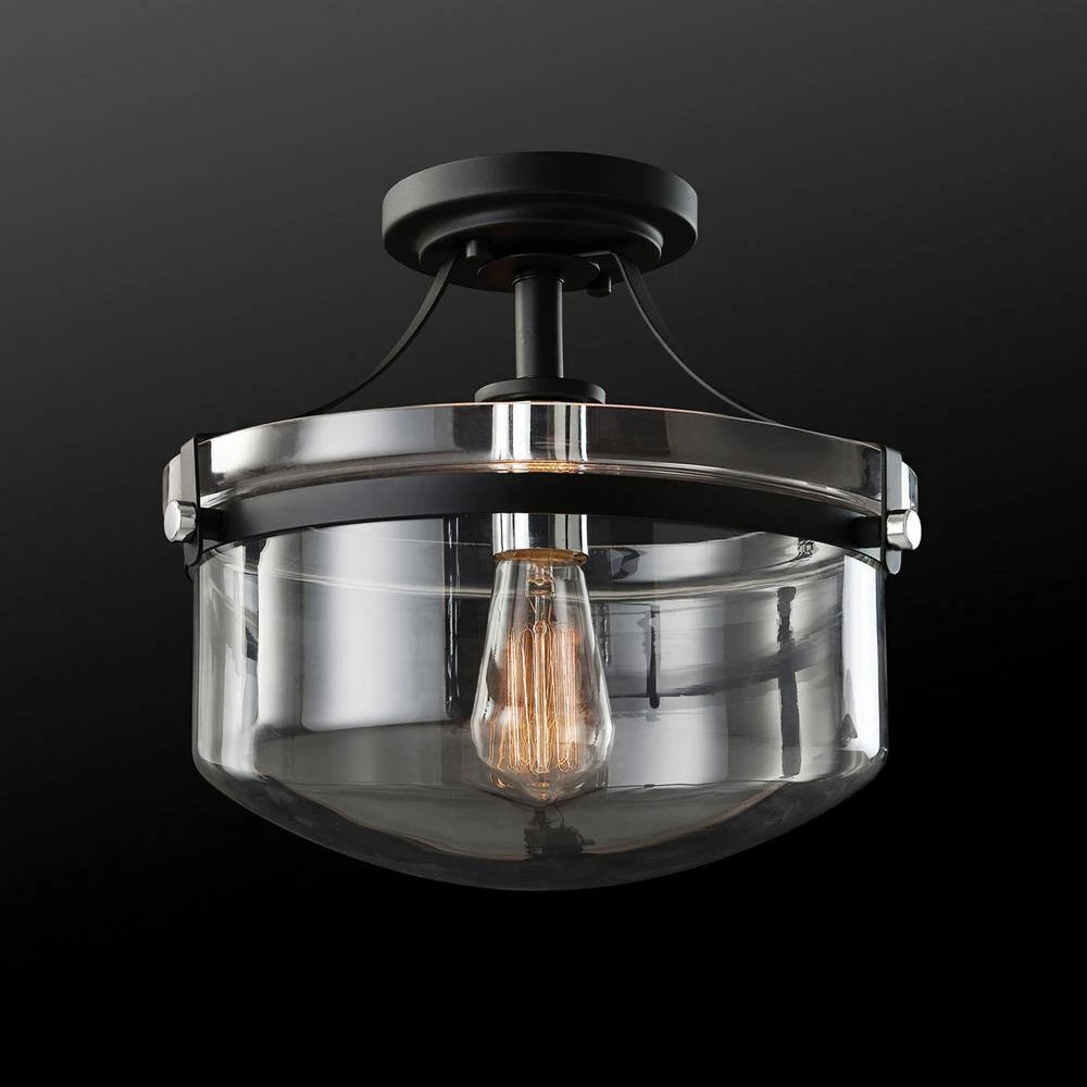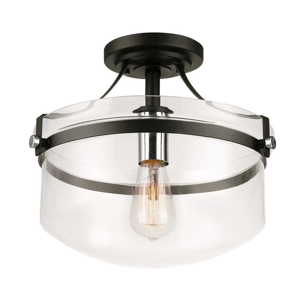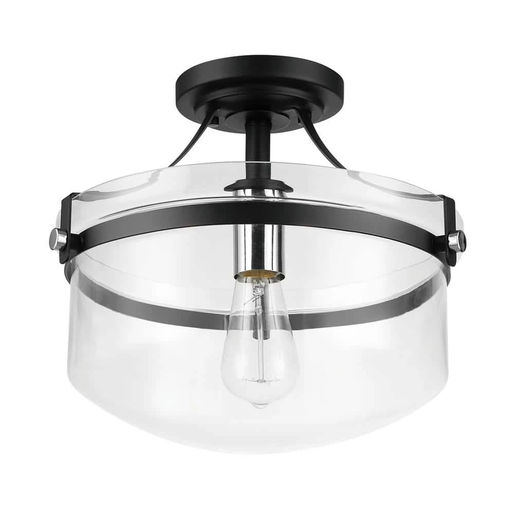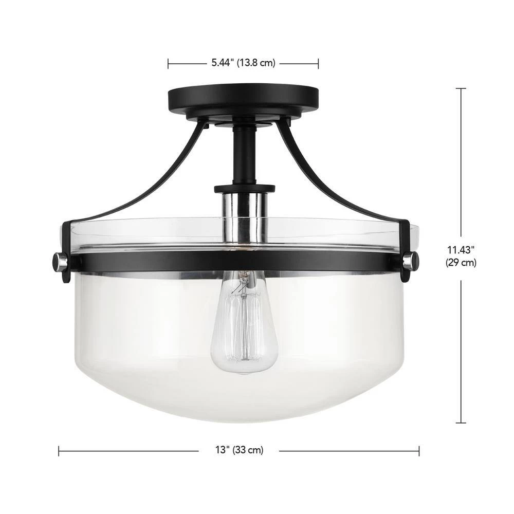 Flush mount lighting is the easiest way to illuminate a space with style. With a clear glass bowl shade, a matte black canopy and shiny chrome details, the Ella Flush Mount Ceiling Light from Globe Electric has a stylish, refined vintage design complementary to all decor. Matte black acts as a neutral that works with any space while the clear glass shade showcases the included vintage Edison bulb. The 13 in. size offers just the right visual appeal and creates a statement making light ideal for a kitchen, foyer, entryway or living room.