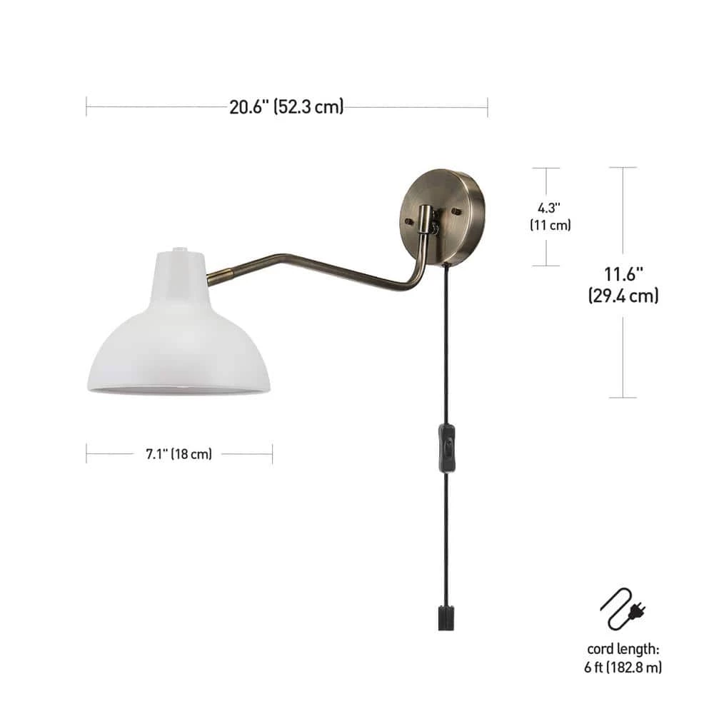 The innovative plug-in or hardwire design of the Elon Wall Sconce allows you to move it around and place it anywhere you want, regardless of an existing hardwire connection or not. The matte white finish has an antique brass arm and canopy to complete the mid-century modern industrial design. Perfect as a bedside light or a living room accent piece beside your favorite chair or couch, this sconce is pivotable – lift the arm and direct the light where you need it most.