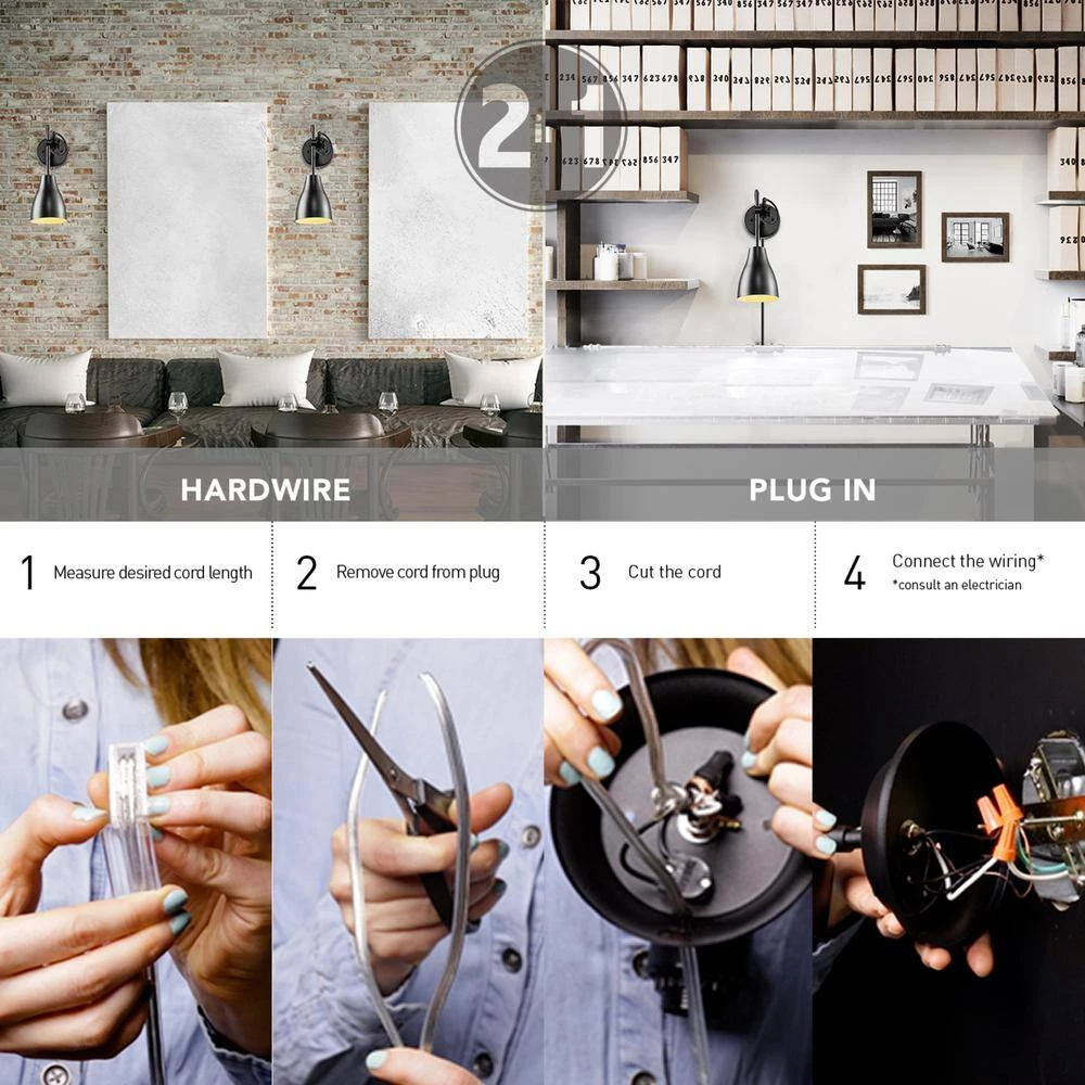 - PLUG-IN OR HARDWIRE CAPABILITY: the innovative 2-in-1 design allows you to install your wall light as a plug-in so you can place it anywhere in your home or use the hardwire option to create a sleek cordless look