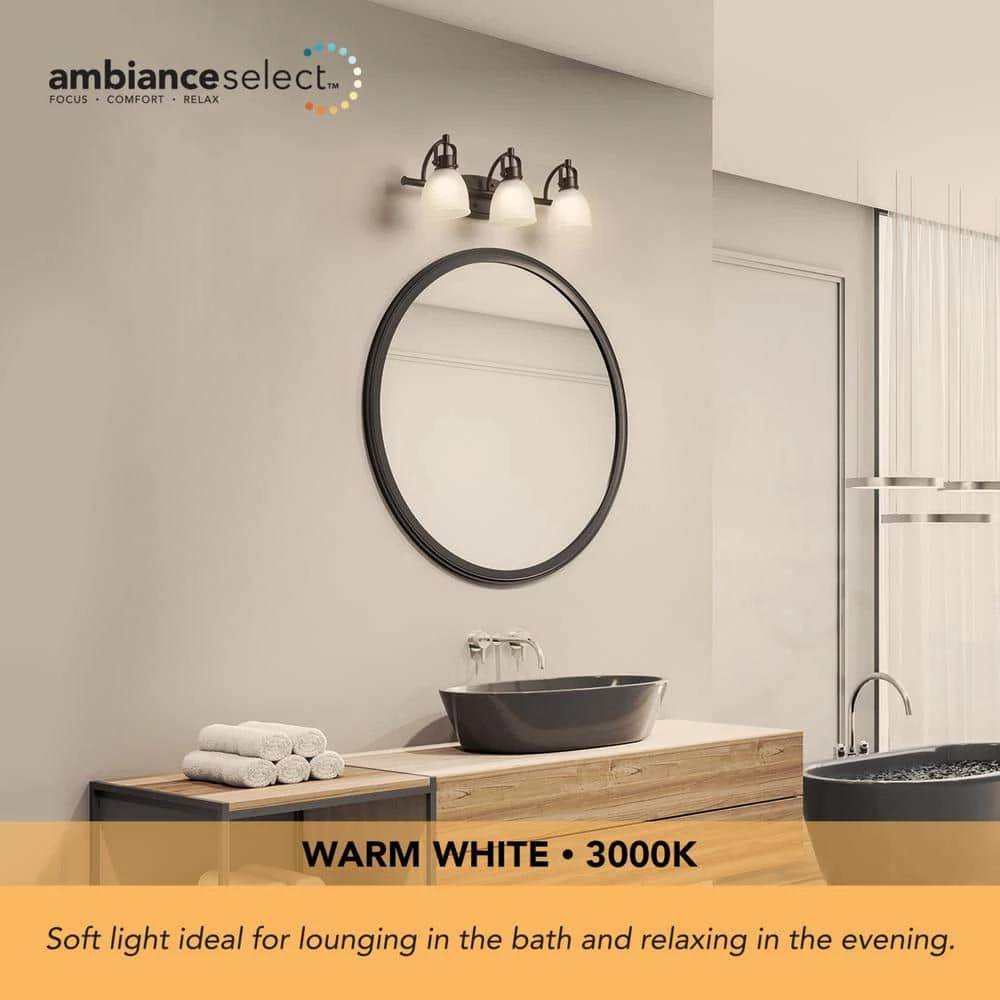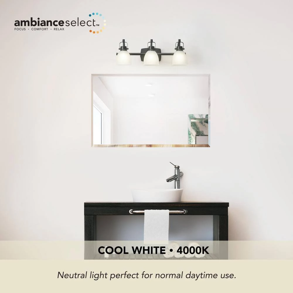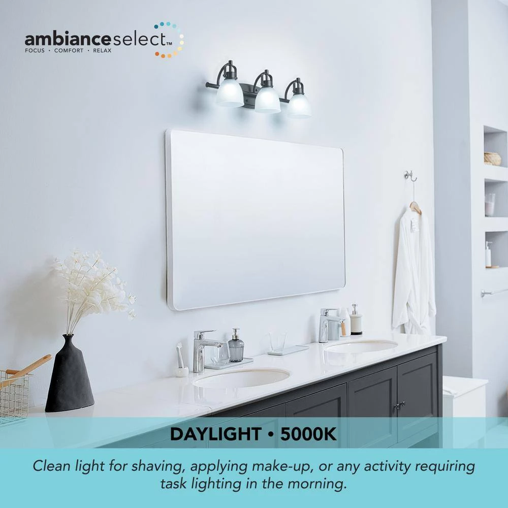 Known for creative innovation, Globe Electric has taken a correlated color temperature select light and made it easily accessible for your personal use. The Gilroy 3-Light LED Integrated Vanity Light has a switch-selectable CCT right on the backplate where you can use it at any time. Follow your circadian rhythm and have a bright daylight 5000-kelvin light in the morning to help you wake up, energize and get ready for your day. Flick the switch in the middle of the day and utilize a cool white 4000-kelvin light that’s ideal for everyday tasks. in the evening, flick the switch one more time to land on a warm soft white 3000-kelvin light to relax and keep your mood soft for the evening. Then, start over again in the morning. Plus, with a black finish, unique design elements and classy frosted glass shades, you can place the Gilroy in any room. Above the mirror in your bathroom, in your dressing room or even in a kitchen. Stay happy and well-lit with Globe Electric.