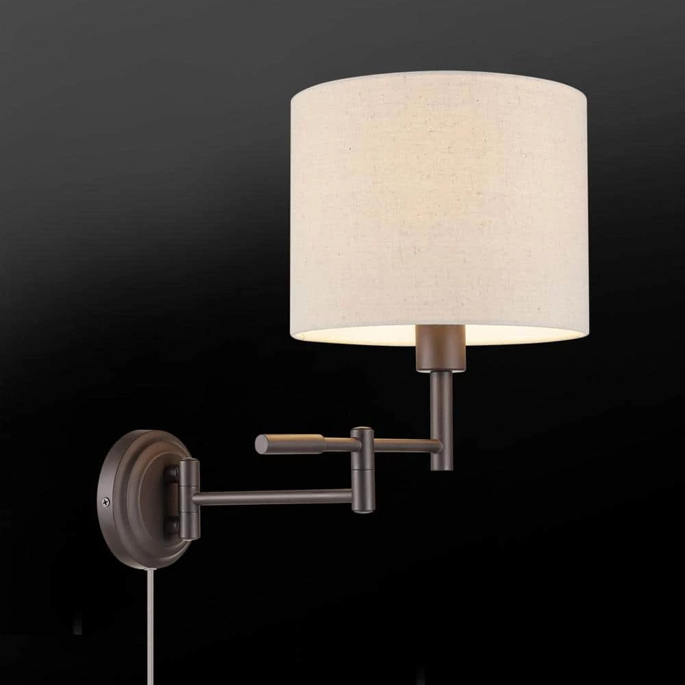 - Casual design: a beige fabric drum shade tops the dark bronze swing arm of the jaclyn plug-in or hardwire wall sconce to provide a casual rustic chic design that’s just as trendy as it is functional