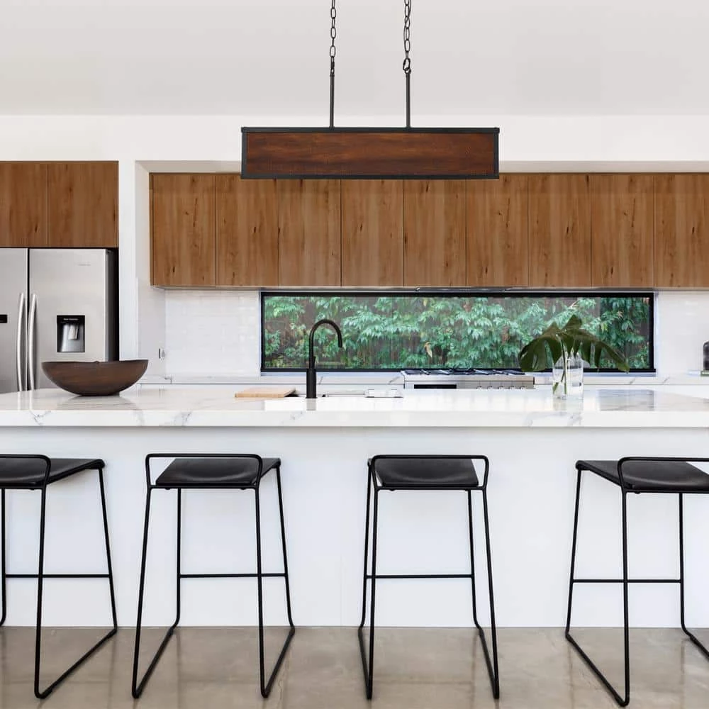 Lighting your home never looked so fine. The Johnnie Integrated LED Pendant Light adds a touch of farmhouse design to any room you place it. The integrated LED shines bright with 1200 Lumens but is a warm white 3000 kelvin color so it provides ambiance as well as task lighting. The stunning faux wood finish panels are perfectly accented with a matte black frame to complete the design. The hanging chain can be adjusted to create the perfect height for above your dining room table, kitchen island or living room seating area.