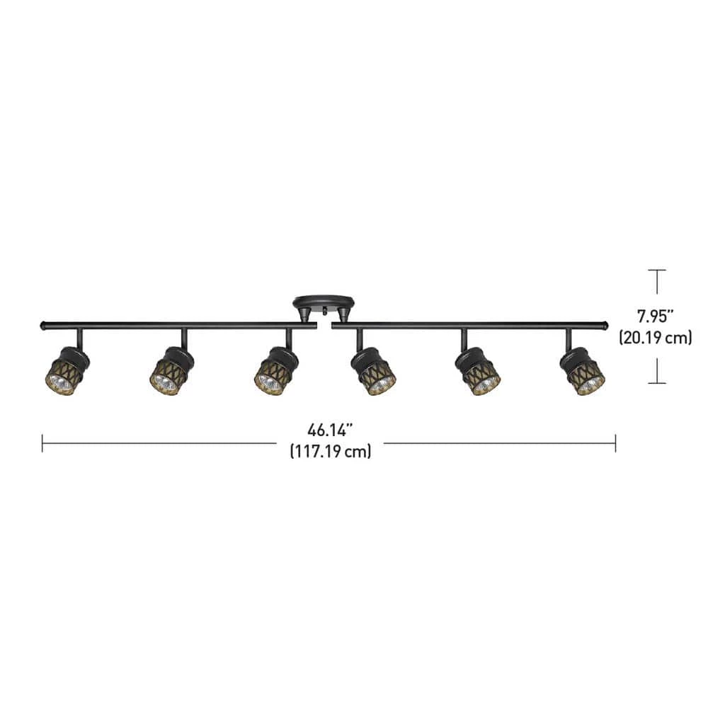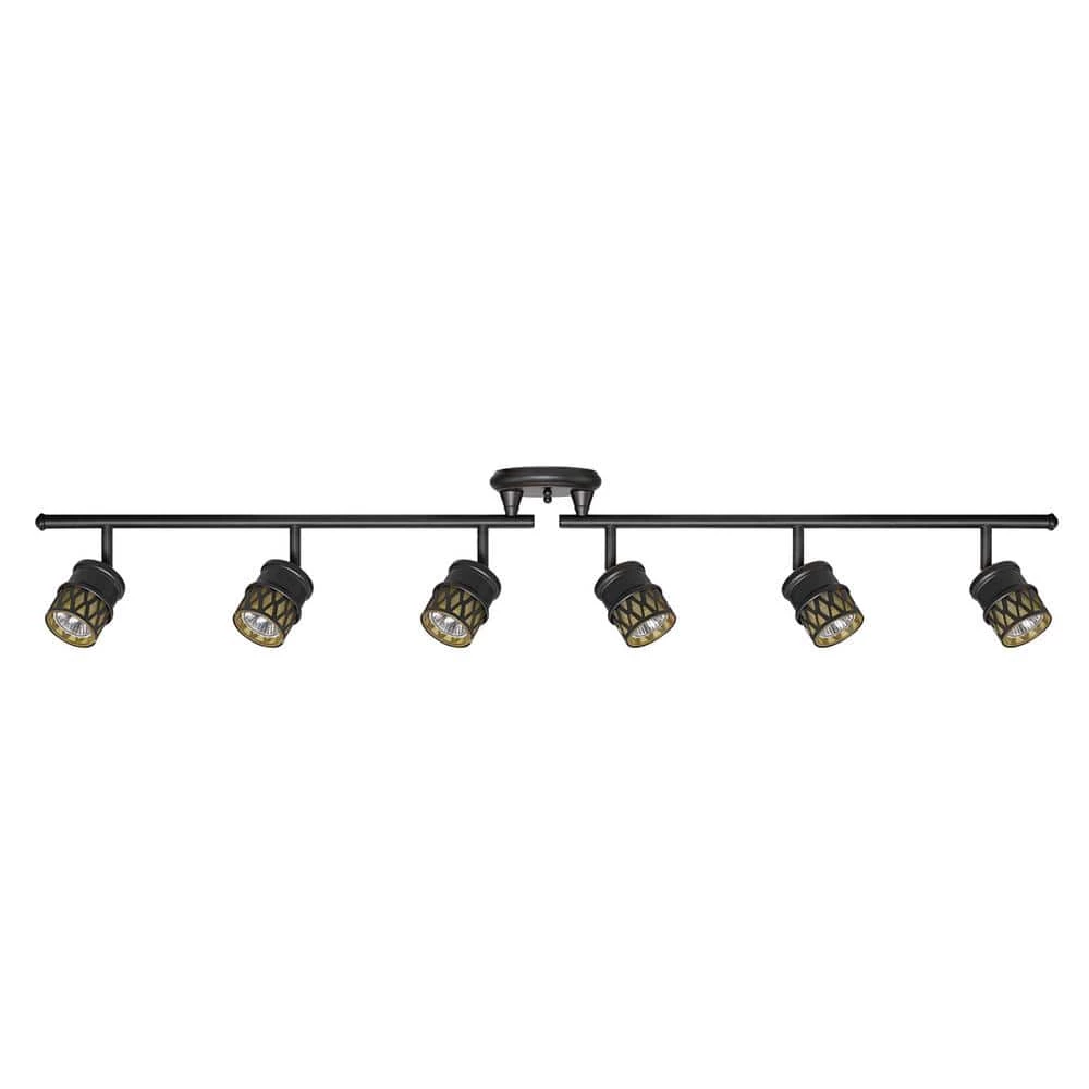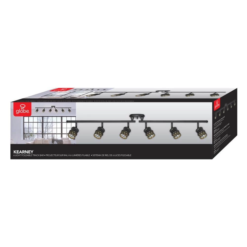 Globe Electric’s Kearney Collection updates any space with style. The 6-Light Foldable Track Lighting with oil rubbed bronze finish and champagne glass shades is ideal for use on ceilings in kitchens, bathrooms, bedrooms, living rooms, hallways, dining rooms – anywhere you want the ability to direct light exactly where needed without multiple light fixtures. Each of the six track heads are independently adjustable so you can direct and focus your light where you need it the most. The oil rubbed? bronze finish brings a new look to a classic design. Includes all mounting hardware for quick and easy installation and six 50W equivalent GU10 halogen light bulbs.