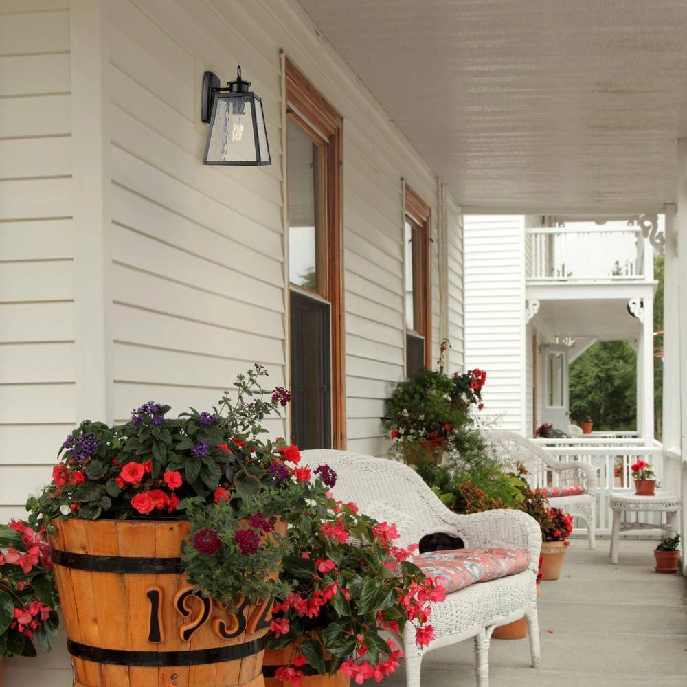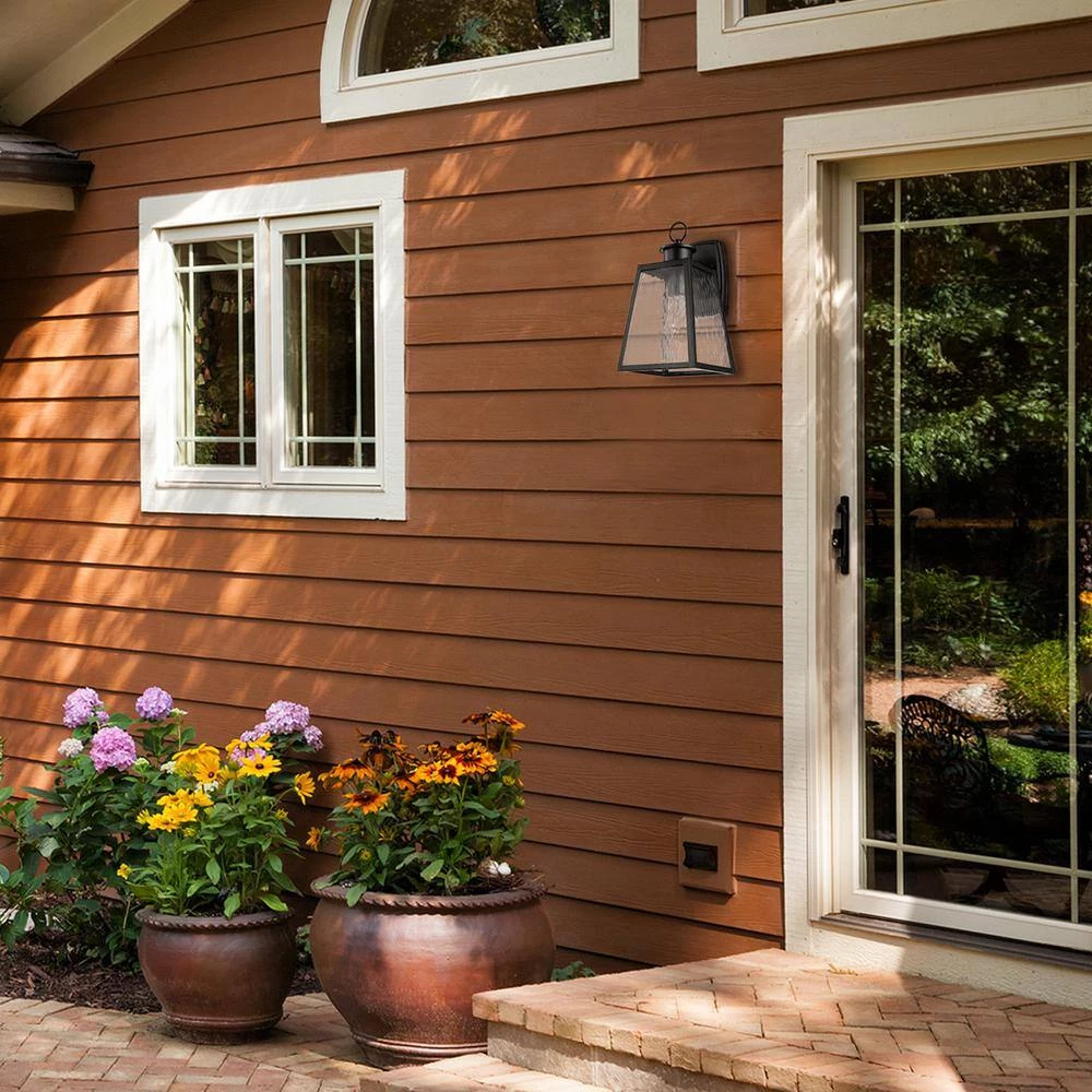 Globe Electric’s Leonard 1-Light Outdoor Wall Sconce is the perfect way to bring old world charm into your life. The lantern shape of this piece is accented by a clean black finish and topped off with beautiful watered glass panes to finish the transitional yet modern look. Using the included vintage inspired bulb completes the warm vintage look. The Leonard Wall Sconce is a standalone piece however, you can give your entrance complete symmetry by hanging 2 of these stunning pieces on either side of your door. Plus, you can use this scone inside to create unique lighting solutions in any room.