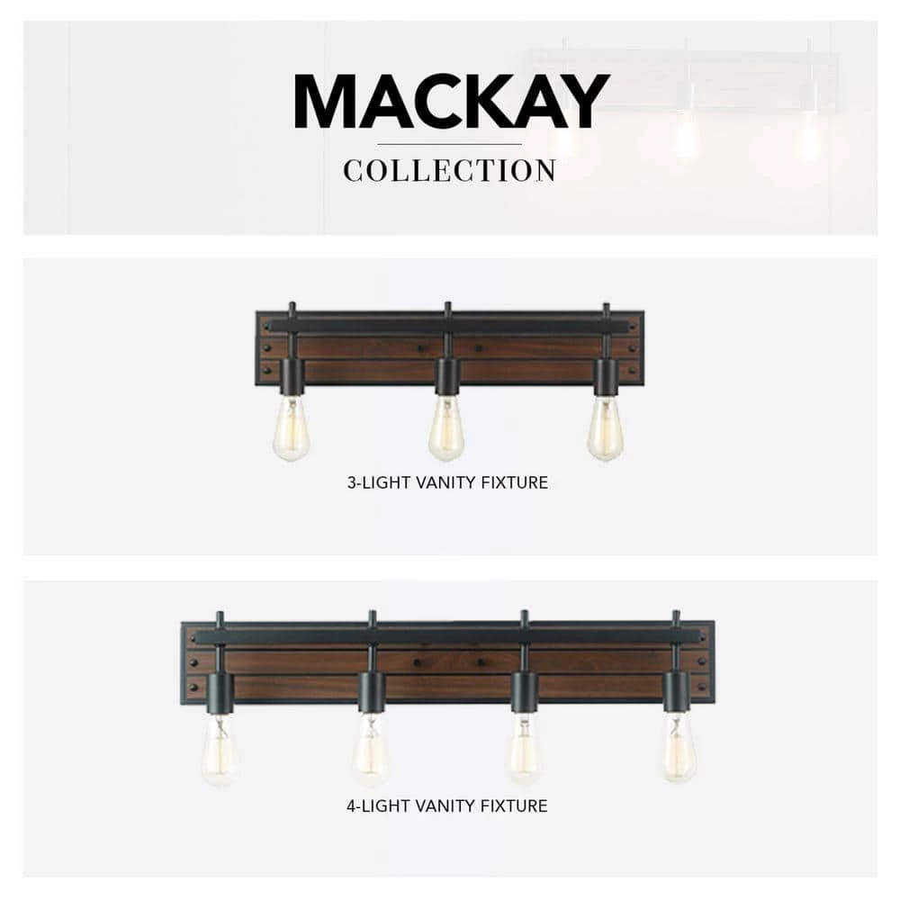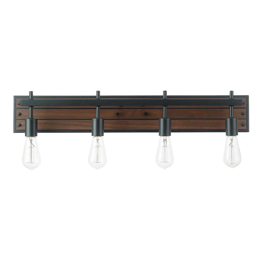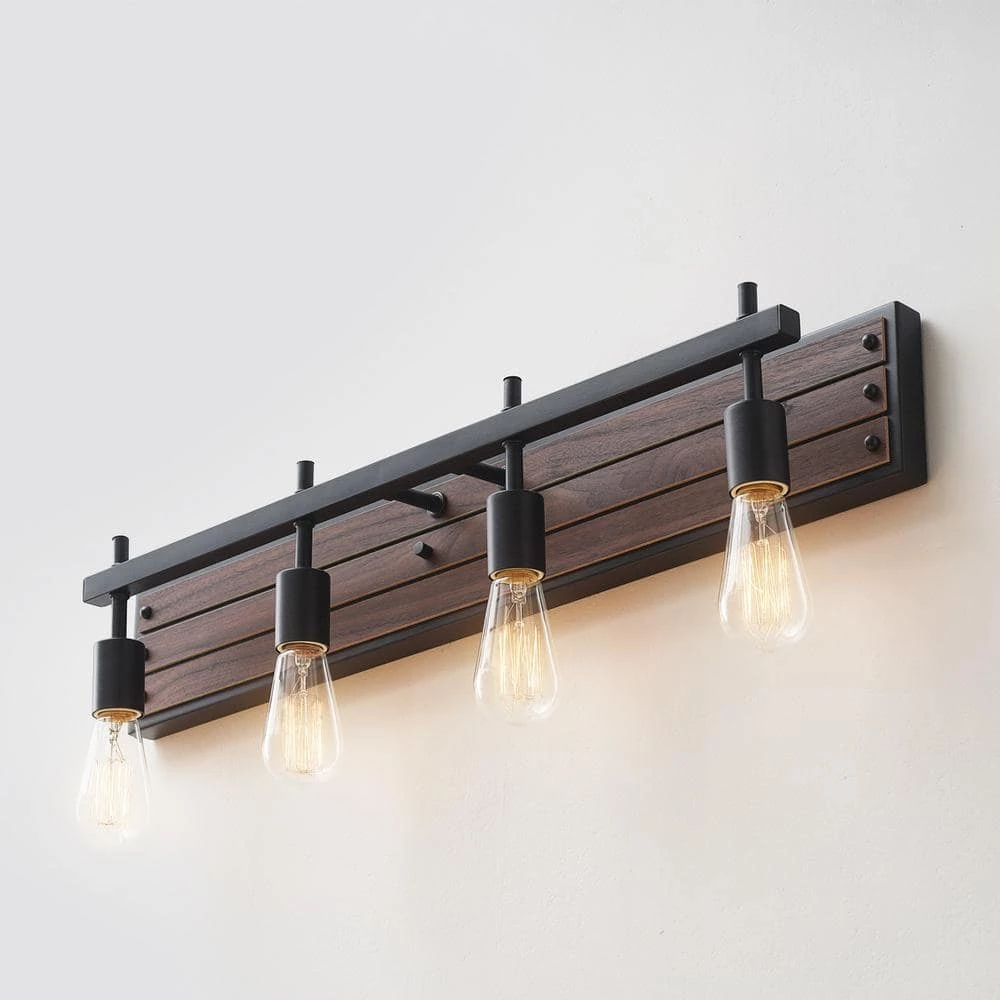 Complete your designer bathroom, kitchen or bedroom with a Globe Electric Mackay Vanity Light. This rustic 4-light fixture boasts open socket construction with faux wood finish planks and matte black socket accents. By using vintage Edison bulbs, you can create a warm light that evokes a vintage rustic feel or you can modernize the look by using designer bulbs to create a dark academia light ideal for any space.
