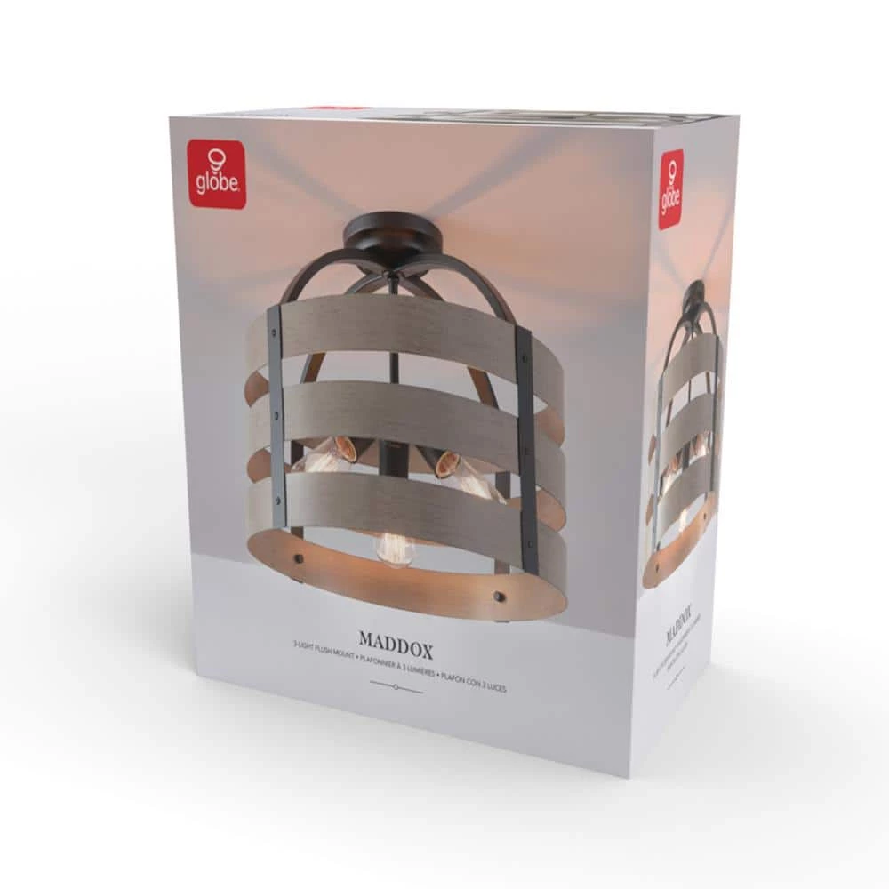 Blending the sleek lines of contemporary design with the warm farmhouse aesthetic, the Maddox Collection by Globe Electric creates a uniquely fresh take on the country living inspired style. With echoes of industrial design, the 3-light flush mount ceiling light combines curved faux wood slats with matte black metal and decorative screws to offer a light that’s complementary to all decor styles. The 16 in. W lets the fixture become a highlight of any room without taking over. Simply put, the Maddox Collection offers warmth and stunning illumination wherever it goes.