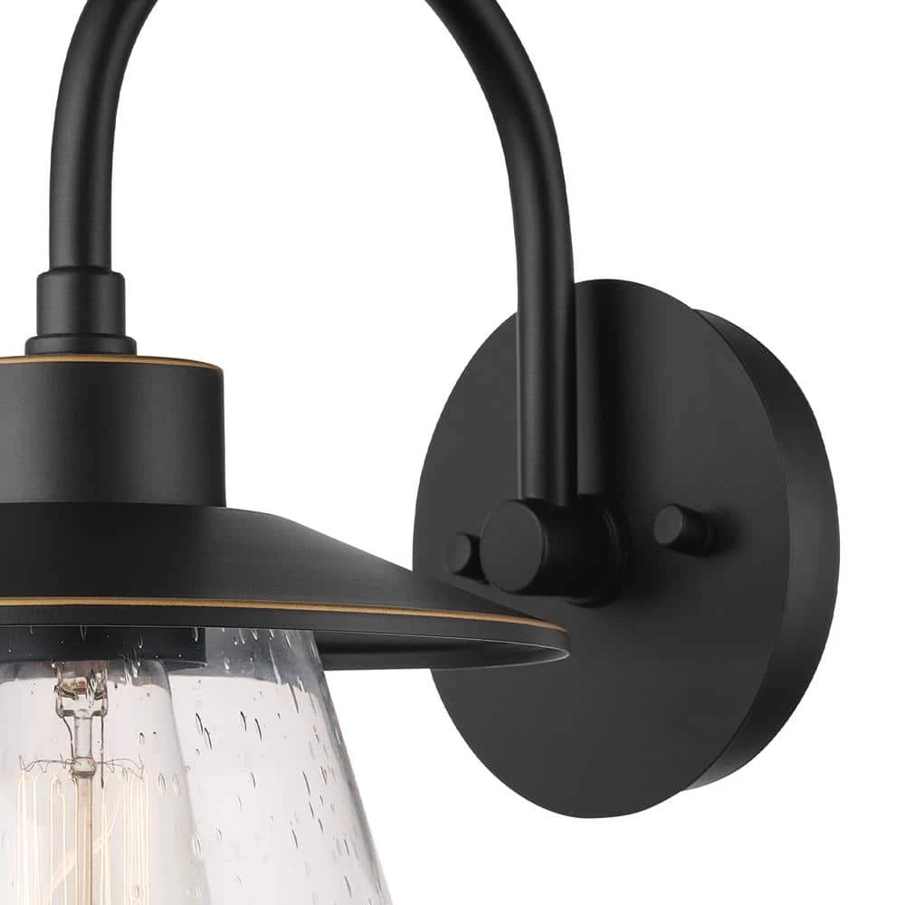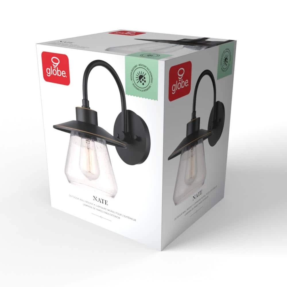 The Nate Collection by Globe Electric is the perfect collection to complete your home decoration. With a modern take on the farmhouse design trend, the Nate 1-Light Outdoor Wall Sconce is the answer to all your lighting needs. A seeded glass shade is topped with a wide metal brim that emphasizes the design while the curved sconce arm adds a modern element. The shade creates gorgeous ambient lighting to finish the warm feel that comes with modern farmhouse design. This light is so versatile, it completely transforms your space. Not only will this look great outside your home, you can use it inside to complete a cohesive look throughout your entire house.