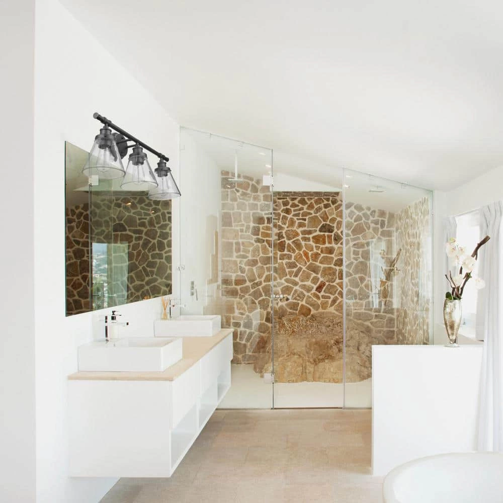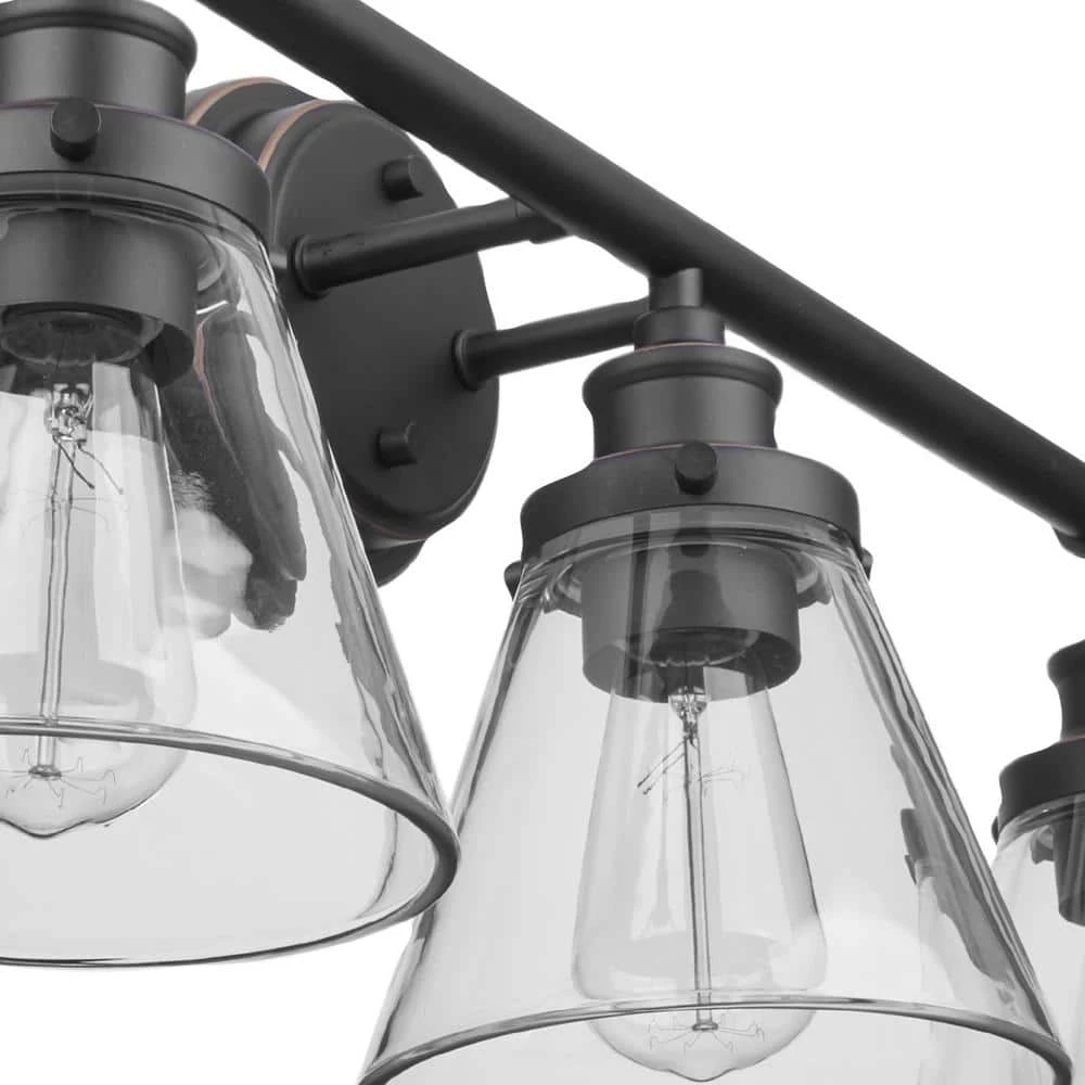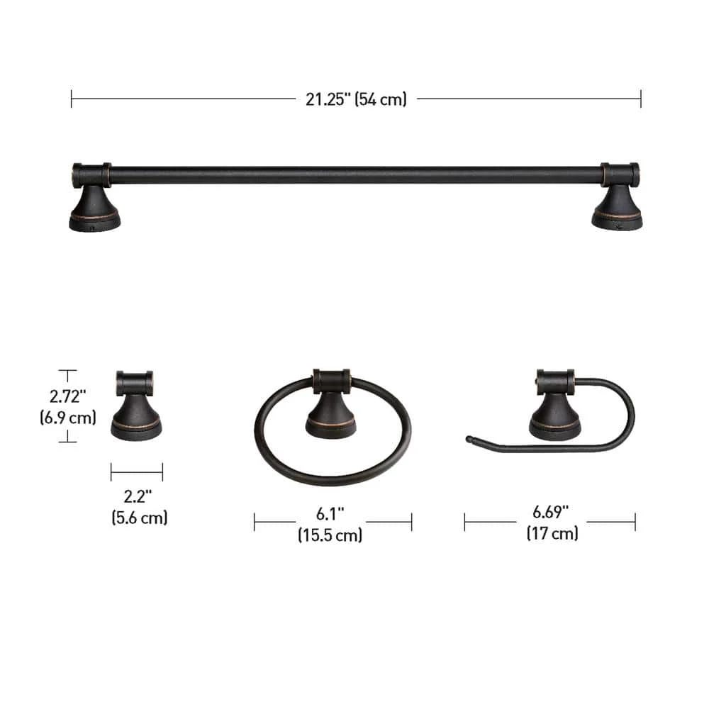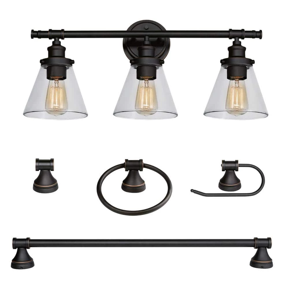 Globe Electric’s 5-Piece Parker All-In-One Bath Set is a wonderful way to update your bathroom with 1-easy step. Combining a modern refined vintage look with an industrial pipe look, these pieces will update any space. Complete with a towel bar, towel ring, robe hook, toilet paper holder and 3-light vanity fixture with thick clear glass shades in a vintage and sleek oil rubbed bronze finish, your bathroom will look streamline and welcoming. Add a compatible dimmer switch to your vanity fixture to create a warm ambiance for a relaxing bath. While the pieces complement each other you can split this set up and use it throughout your home. The towel bar makes an excellent shoe holder. The towel ring would be great in your kitchen. The vanity light would work in your bedroom. Think outside the box. Three medium base 60-Watt bulbs are required and sold separately. The towel bar measures 20.87 in. long and sits 2.72 in. from the wall. The towel ring is 6.1 in. wide, 6.88 in. tall and sits 2.72 in. away from the wall. The robe hook is 2.2 in. wide at the base and sits 2.2 in. from the wall. The toilet paper holder is 6.69 in. wide and sits 2.77 in. from the wall. The 3-light vanity is 24.63 in. W 11 in. H and sits about 7.92 in. from the wall. Each shade is 6.5 in. wide and 5.32 in. high.