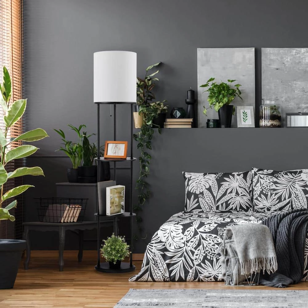 The Reid Etagere Column Floor Lamp is the trendiest lamp on the market right now. With three 14.5 in. shelves and a gorgeous white linen shade, this lamp showcases all your favorite things in a stylish package. The matte black finish is the perfect neutral for any of your favorite items – be it a book, picture frame or small plant. Sitting just shy of 58 in. you can place this lamp in your favorite corner, by your sofa or even by your favorite chair for easy lighting convenience. Have fun decorating.
