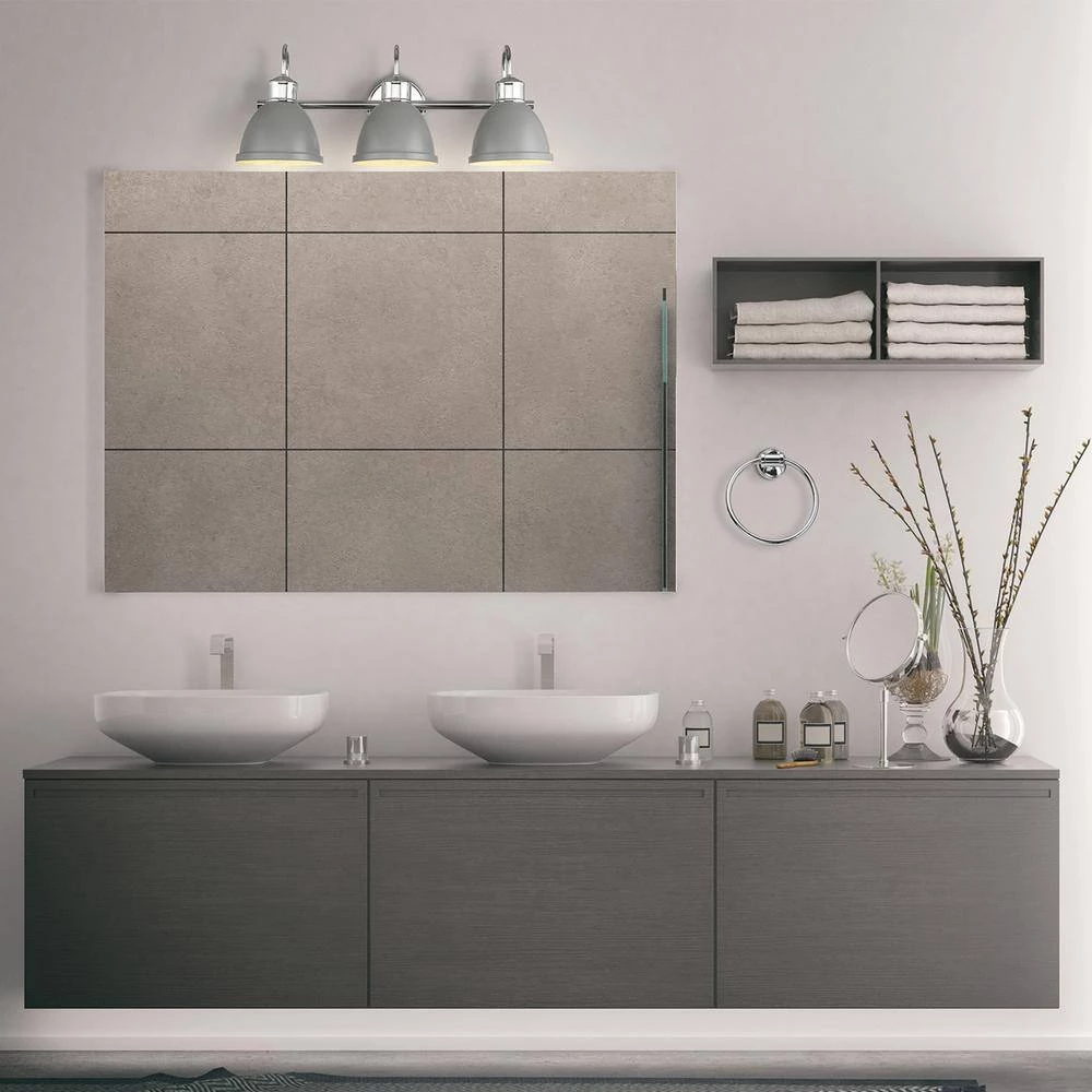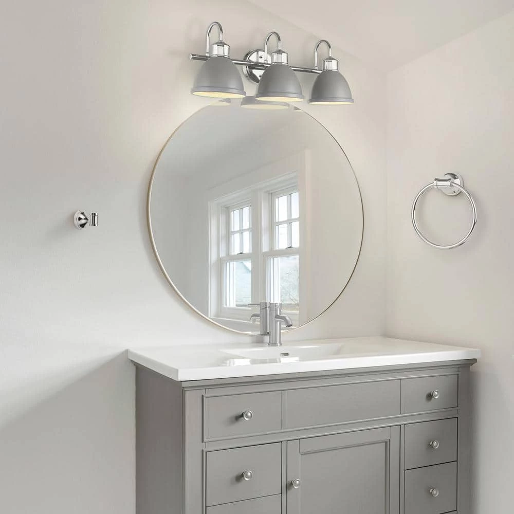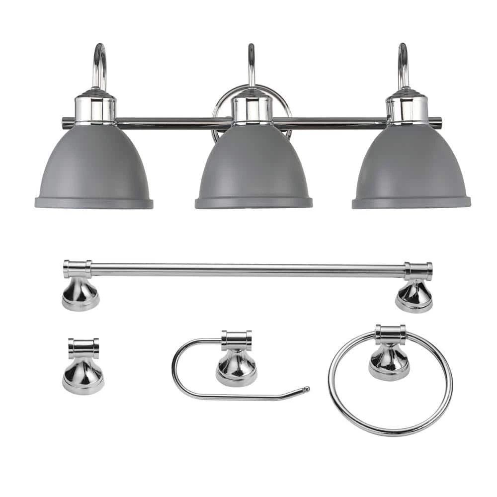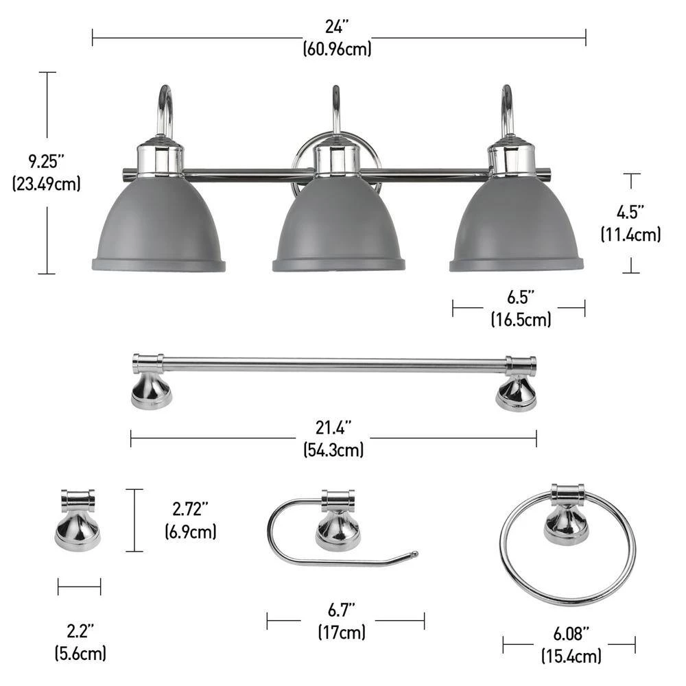 With a refined profile, modern chrome accents and industrial style, the Sydney 5-Piece Bathroom Set adds a refined industrial element to any space. The matte gray shades of the vanity light fixture diffuse the light perfectly to create a spread of light that is not pointed. Update and modernize your bathroom or add the 3-light vanity to your bedroom to create a nice little getting ready nook. Complete with a towel bar, towel ring, robe hook, and toilet paper holder in chrome, your bathroom will look streamline and welcoming. While the-pieces complement each other you can split this set up and use it throughout your home. The towel bar makes an excellent shoe holder. The towel ring would be great in your kitchen. The vanity light would work in your bedroom. Think outside the box.