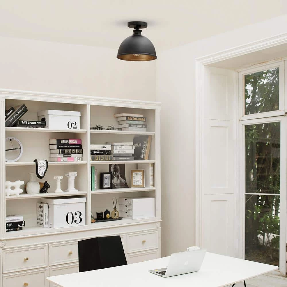 Perfect for adding the right amount of light to any space, the Tallulah Flush Mount Ceiling Light offers a touch of brightness and warmth with timeless classic style. The moody matte black exterior is lightened by a gold interior shade that complements your existing decor. Ideal for an entryway, office, living room or den, this light sits in the pocket of dark academia design and features an antiquesque aesthetic.