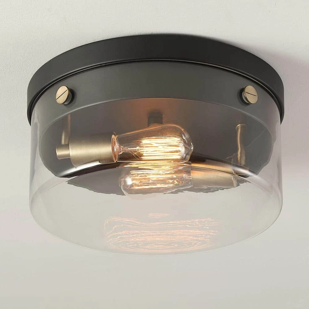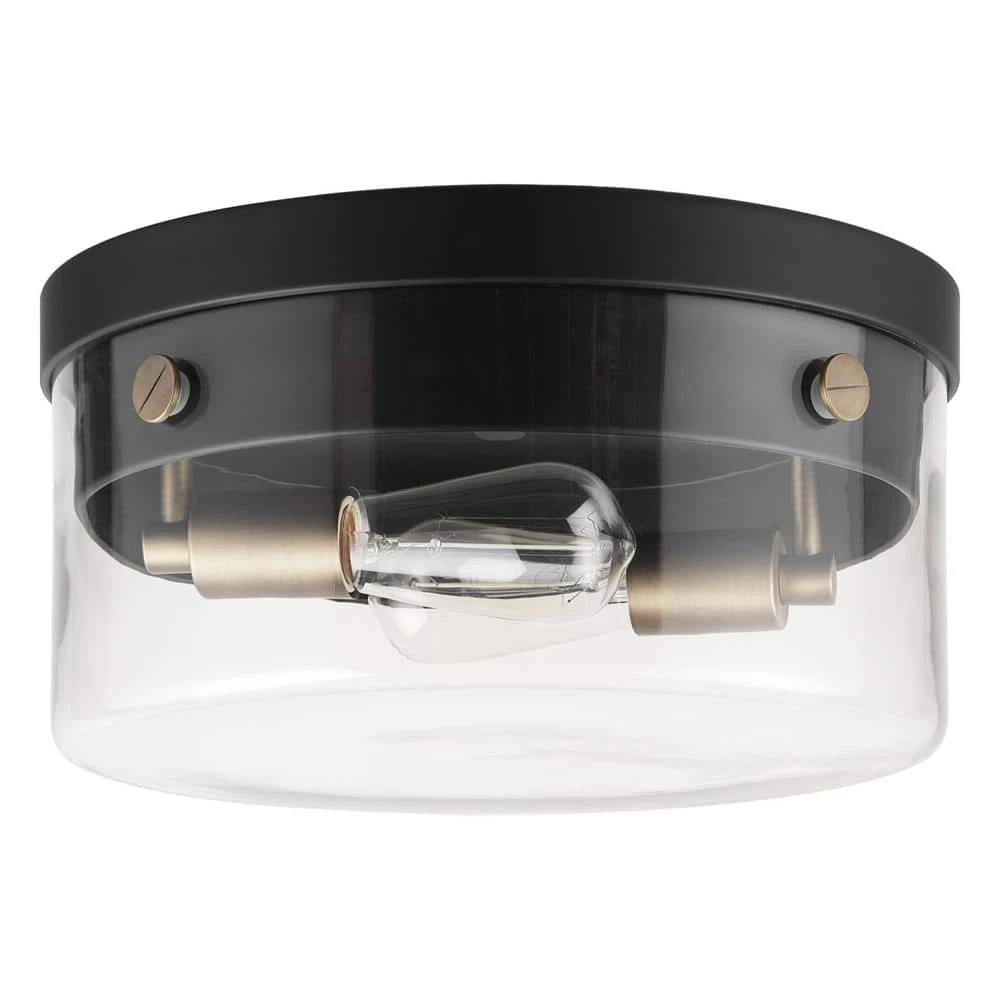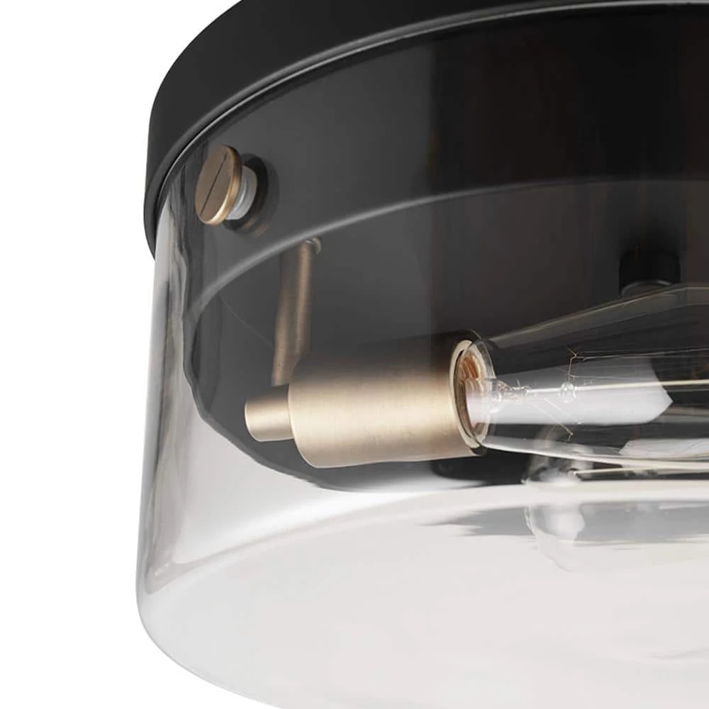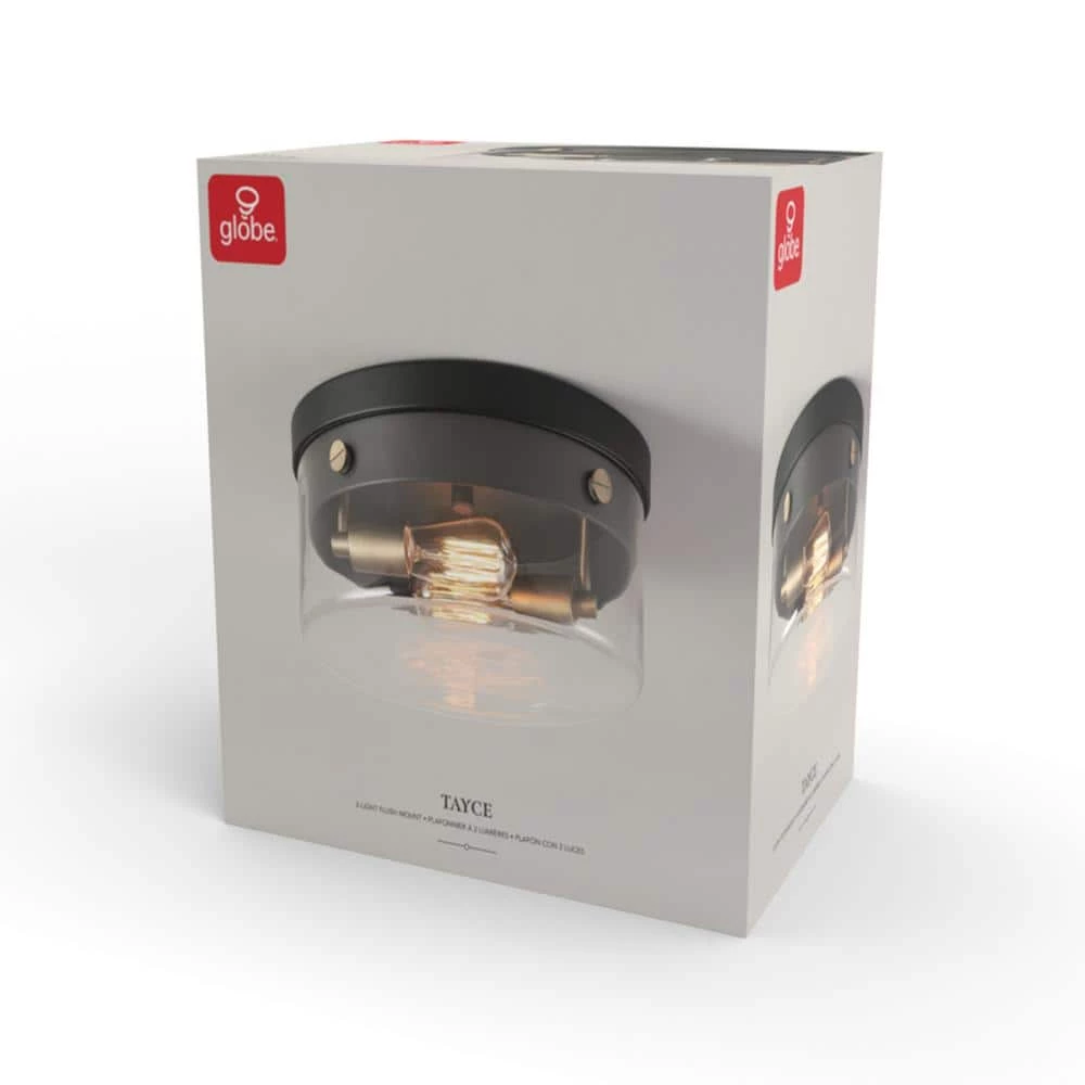 The clear glass shade, matte black finish and matte brass accents of the Tayce 2-Light Flush Mount Ceiling Light by Globe Electric offers a stunning modern glam light perfect for every room in your home. The matte brass elevates the design while the matte black acts as a neutral color that is complementary to all decor. The clear glass shade lets you showcase the bulbs of your choice so you can customize your light to make it work for every space.