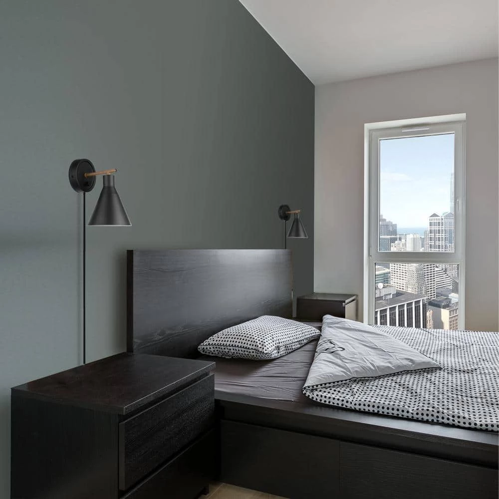 The Tristan Collection by Globe Electric offers modern design for every decor style. with a trendy cone shade and a stepless rotary dimmer switch, this plug-in or hardwire wall sconce offers ideal lighting for any time of the day. Perfect for a living room, bedroom, home office or den, the matte black finish and faux wood accent bar offers a lofty chic style that complements your existing decor. The stepless rotary dimmer switch allows you to seamlessly move through different levels of light to choose what you need for any given situation. Plug it in or hardwire it in place and enjoy unique lighting for years to come.