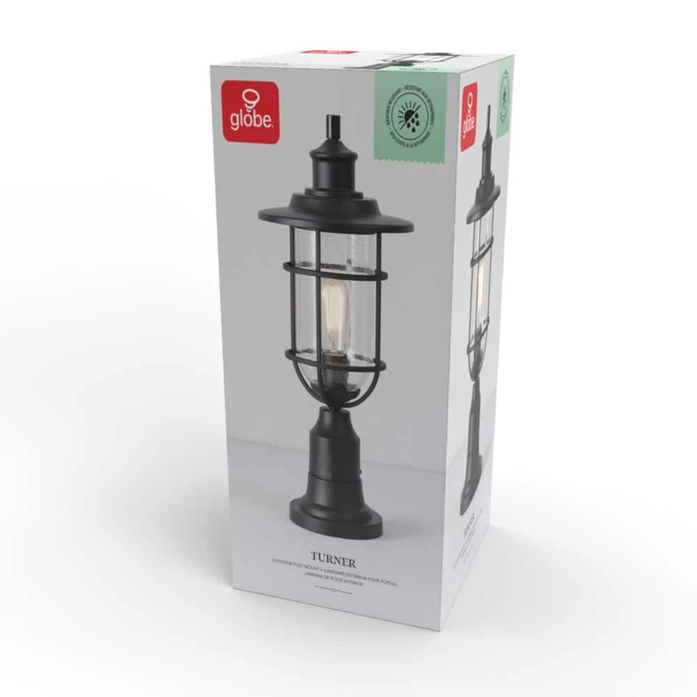 The Turner Collection by Globe Electric is a great way to bring a vintage element to any space. A modern black finish plus a traditionally coastal caged shade produces a truly versatile assortment. A vintage-inspired bulb would add the right embellishment to the Turner Outdoor Lamp Post Light Fixture to make this piece truly a work of art. The matte black finish complements all outdoor decor and showcases your bulb in just the right way. This lamp post light fixture has such clean lines, it will make a grand finishing touch to your walkway or driveway. To create a finished look, pair this piece up to have symmetry at your front door or at the end of your driveway.