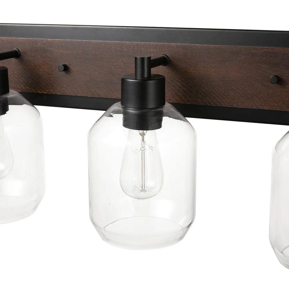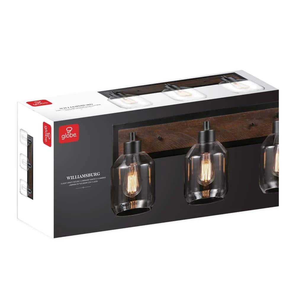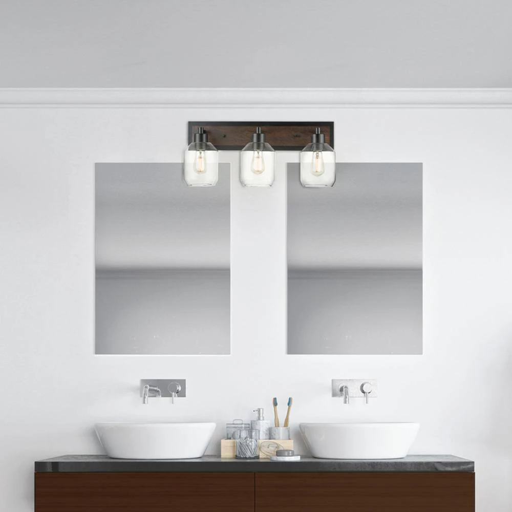 - Modern farmhouse: the warm dark faux wood finish and dark metal accents of the Williamsburg 3-light vanity light is perfect for bringing an inviting turn-of-the-century industrial yet rustic look to any area